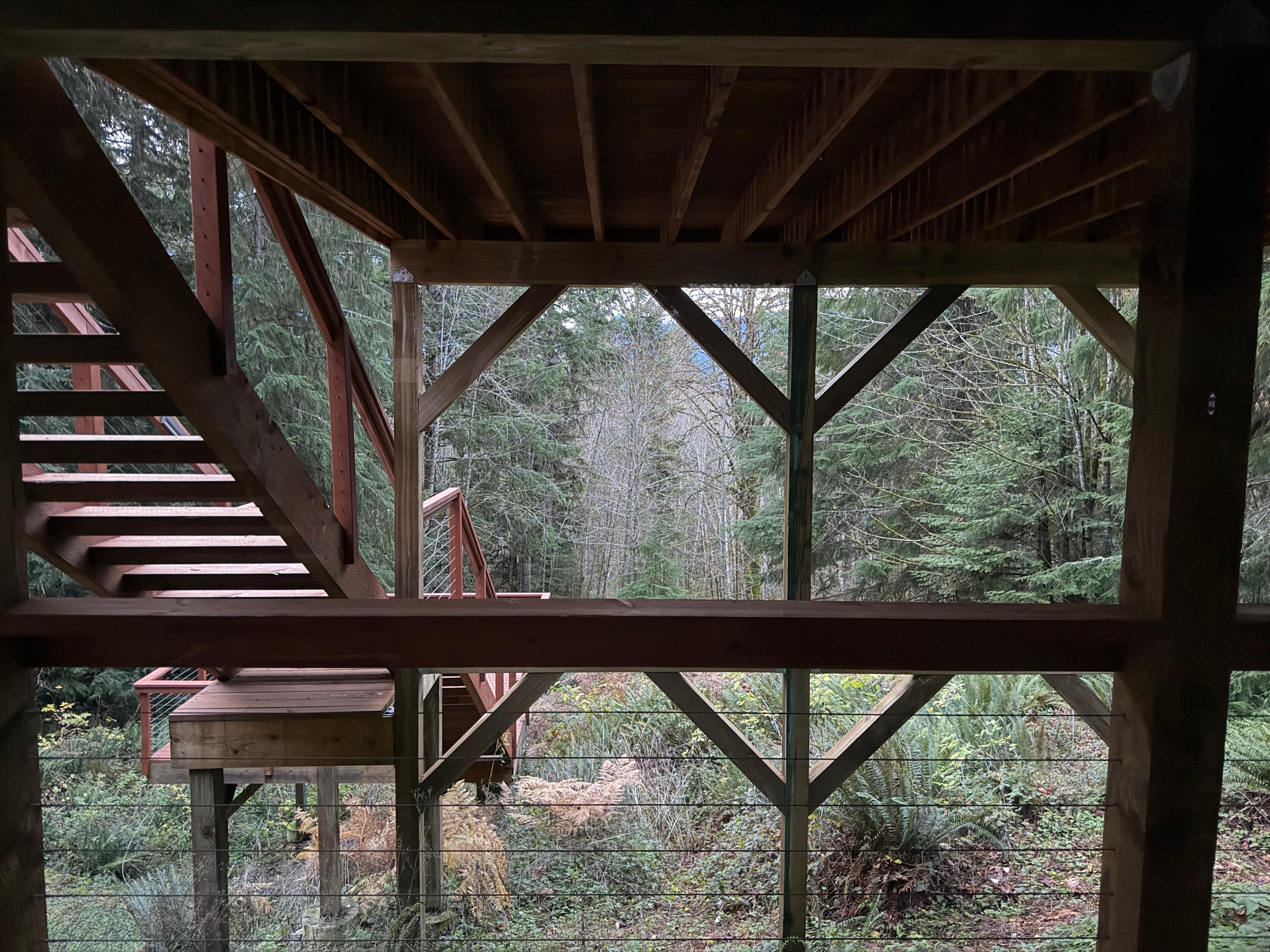 MossHenge`s outdoor spaces are truly magical. Enjoy the quiet sounds of the forest and nearby burbling stream on our spacious upper deck, featuring a dining table (seating 4), adirondack chairs, café lights, a gas fire table and outdoor heating for cool nights, and a deck umbrella for sunny (or rainy) days. The lower deck boasts a huge hot tub, perfect for relaxing weary muscles after a day of hiking, climbing, or exploring Mt. Rainier, or just relaxing with your sweetheart and watching the starry night sky in the perfect privacy MossHenge offers.