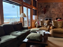 The primary bedroom features a king bed and a private balcony with stunning views of Smuggler Mountain. Its ensuite bathroom includes a spacious walk-in shower. The guest bedroom offers two twin beds, which can be converted into a king upon request, and convenient access to an additional full bathroom.
