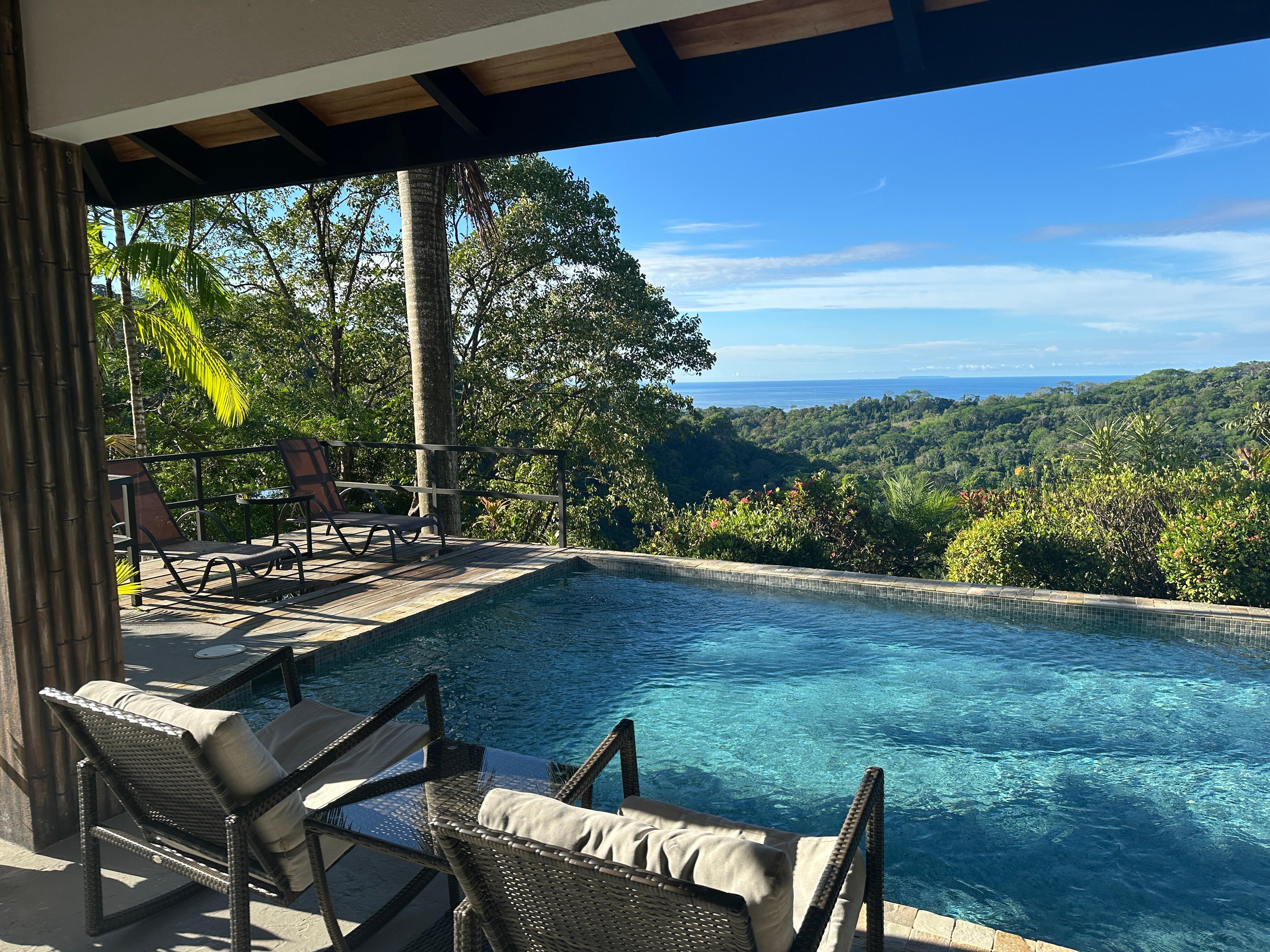 Keywords: Mountain Top: Ocean View, Jungle Views, Privacy; Waterfall; jungle valleys on two sides; two master suites; Smart TV, WIFI; Full kitchen; indoor Jacuzzi tub; outdoor shower; indoor outdoor living; Property manager nearby for assistance, 10 minutes above highway on a paved, 4x4 accessible road ; from the bottom of our road it is 3 minutes south to Uvita and 15 minutes north to Dominical.