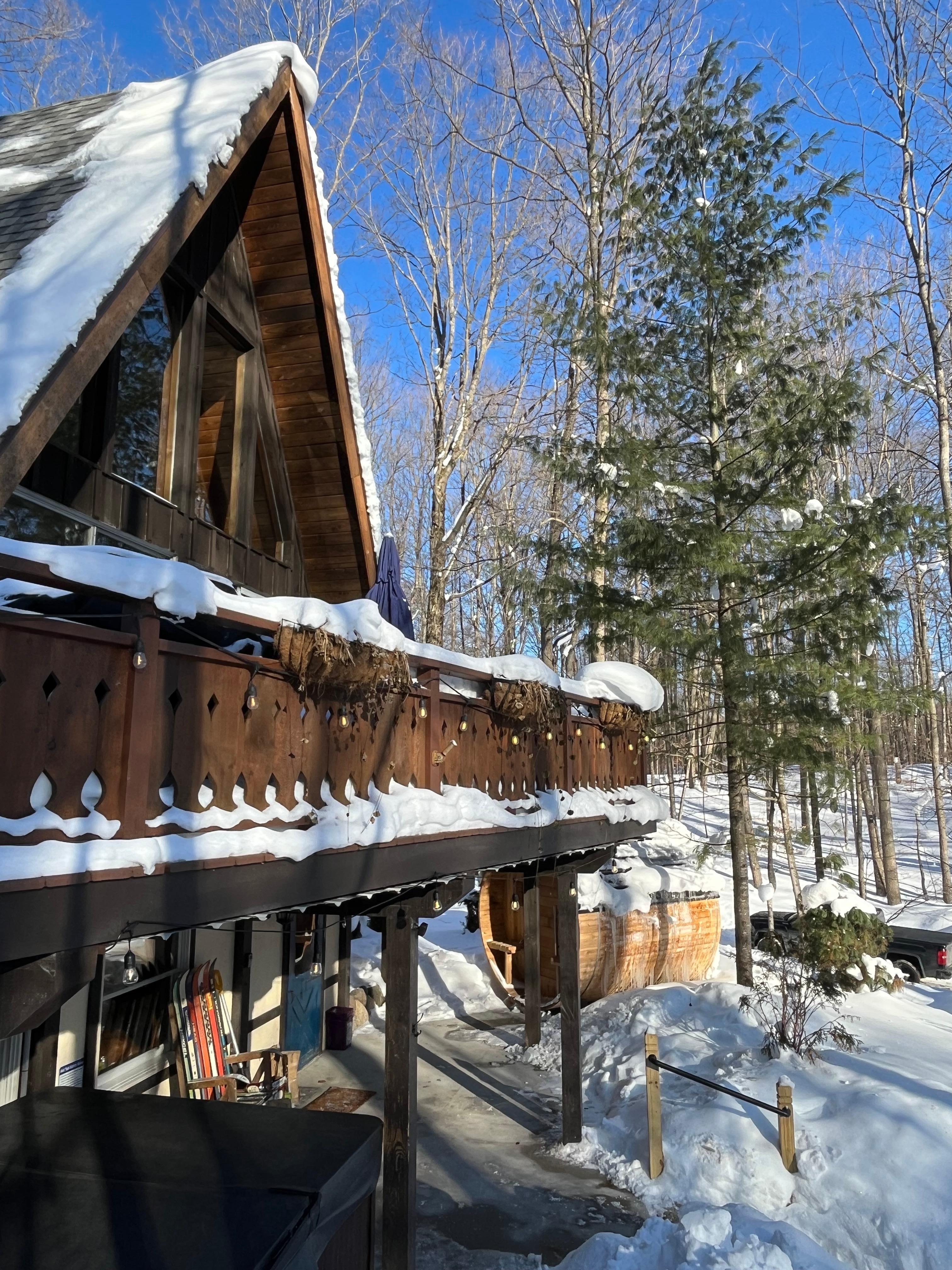 .Spend your vacation at the Grumpy Fox Ski Den nestled in the woods in Shanty Creek Resort relaxing by the fire pit, 6-7 person hot tub and barrel sauna. This home is a unique & comfortable 4 bedroom home located a mile from Schuss Mountain, surrounded by beautiful golf courses and ten miles from the stunning Torch Lake. There is also access to the Lakeview Hotel indoor & outdoor pool & spa.