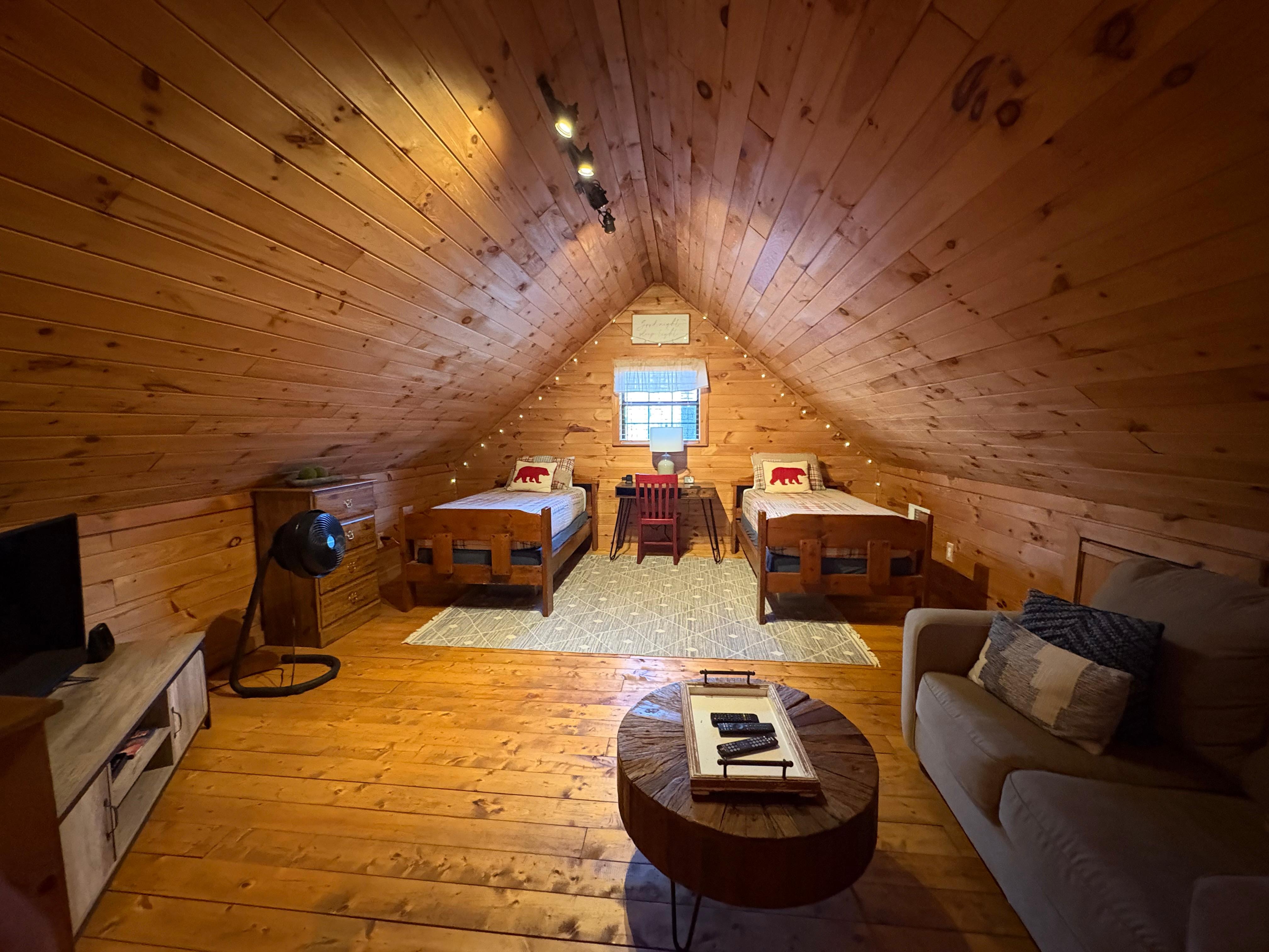 * Charming “cabin fort” décor + twinkle lights perfect for nighttime stories