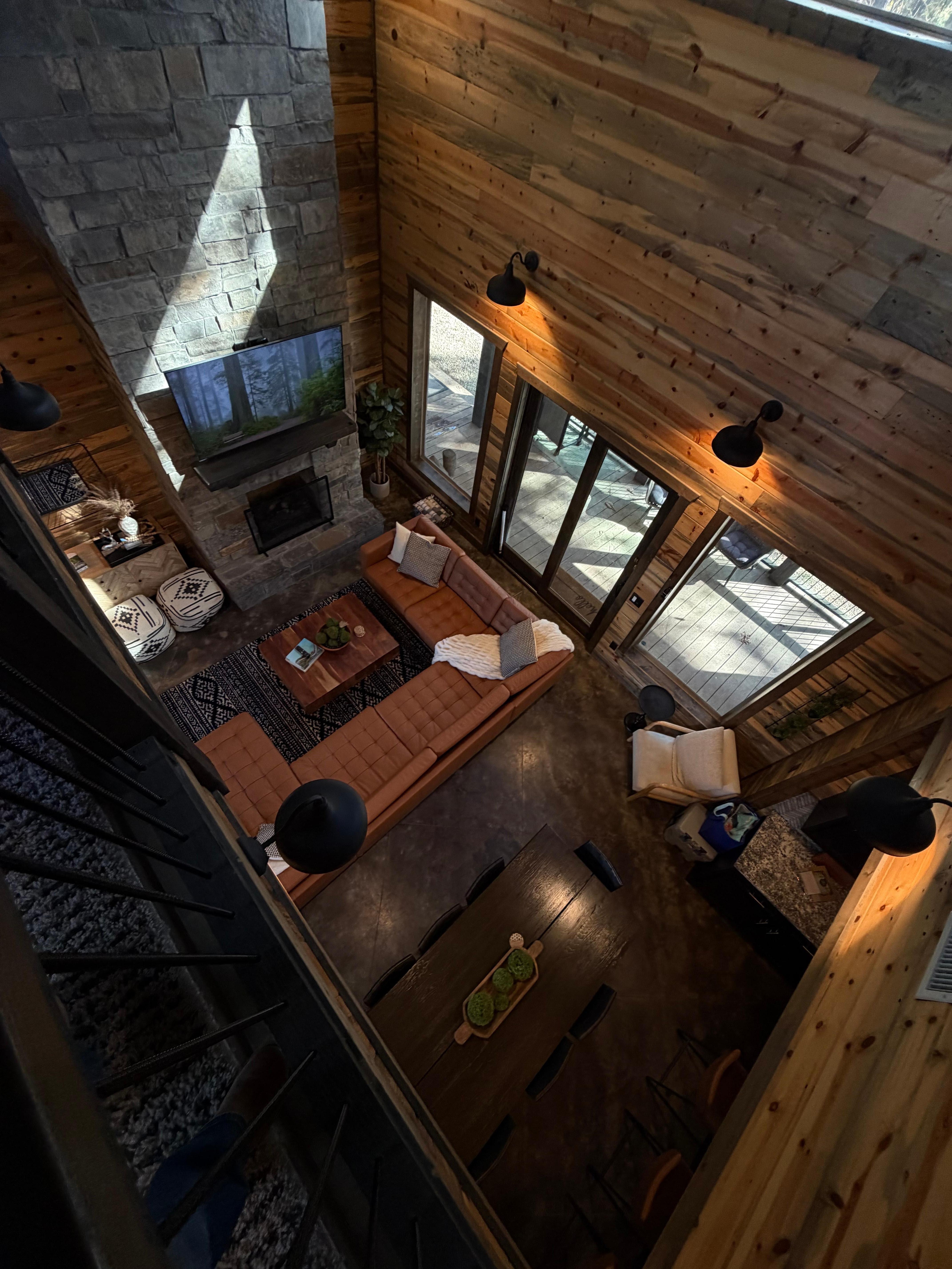 Our two story, 2300 sf cabin provides ample space to gather and spread out. On the ground floor you'll find an open concept kitchen, dining area and living room. The living room has a comfortable seating area, a gas fireplace (operational seasonal) and a 65" Samsung TV. The kitchen is equipped with stainless steel appliances including a dishwasher, an electric oven and range. A large island with granite countertops provides plenty of counter space for making home cooked meals. We also offer a coffee bar with a Keurig Duo coffee maker and an assortment of K-cups and teas. The dining table is located adjacent to the kitchen island. The dining table seats 8 and the kitchen island has 4 counter chairs. A high chair is available for use.