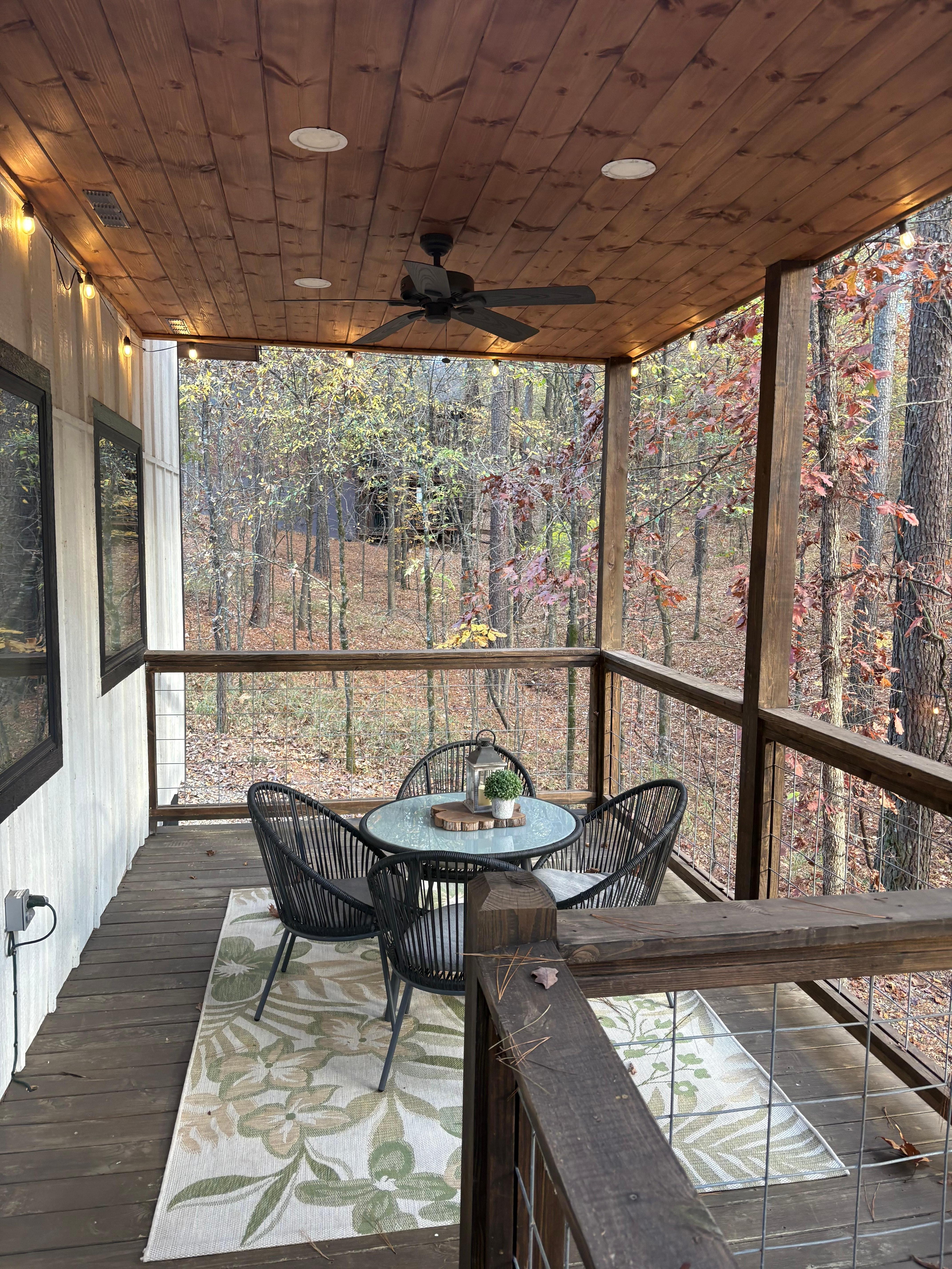 We didn’t forget about the exterior! The front porch offers rocking chairs for enjoying your morning coffee or evening beverage. And the back porches... so many options. Relax in the hot tub, watch TV by the outdoor fireplace (seasonal) in the outdoor seating, dine al fresco around the outdoor dining table overlooking the forest, or sway the day away on our upstairs deck where half covers the suspended daybeds and half extends into the treetops, with chairs for lounging in the breeze. Also enjoy grilling your favorite dish on our propane grill (propane and grill utensils are provided), playing a game of corn hole or ladder golf, and cozying up around the string lights and fire pit when the sun goes down under the most gorgeous starry sky you’ve ever seen. Don’t be surprised if deer come by for a visit... it’s a common occurrence. We are on an oversized 1.3 acre tucked-away lot, with lots of room to spread out and relax. It's pure bliss!