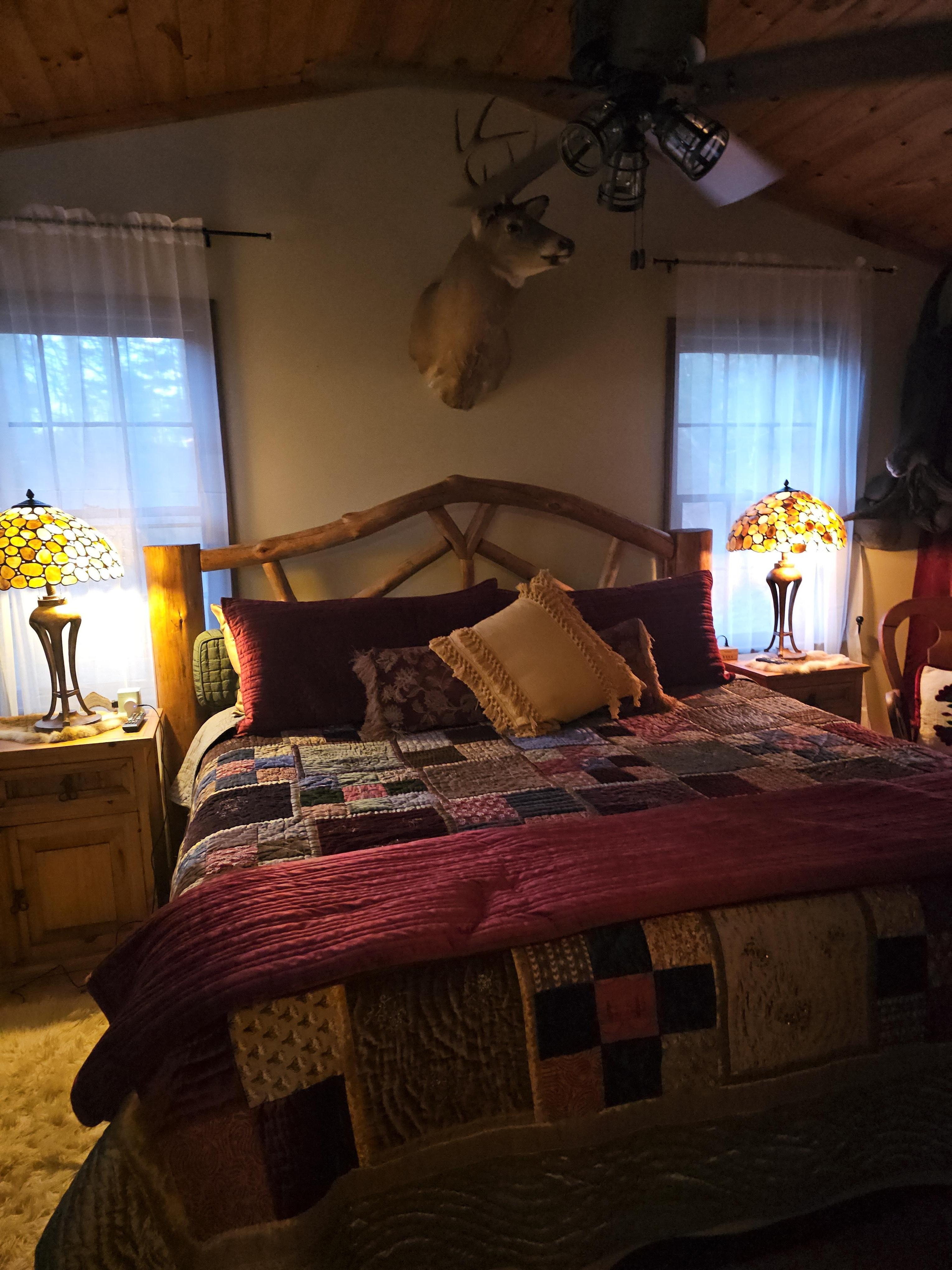Bedroom 1. The Buck bedroom is furnished with a plush King sized log bed & 42 Smart TV.