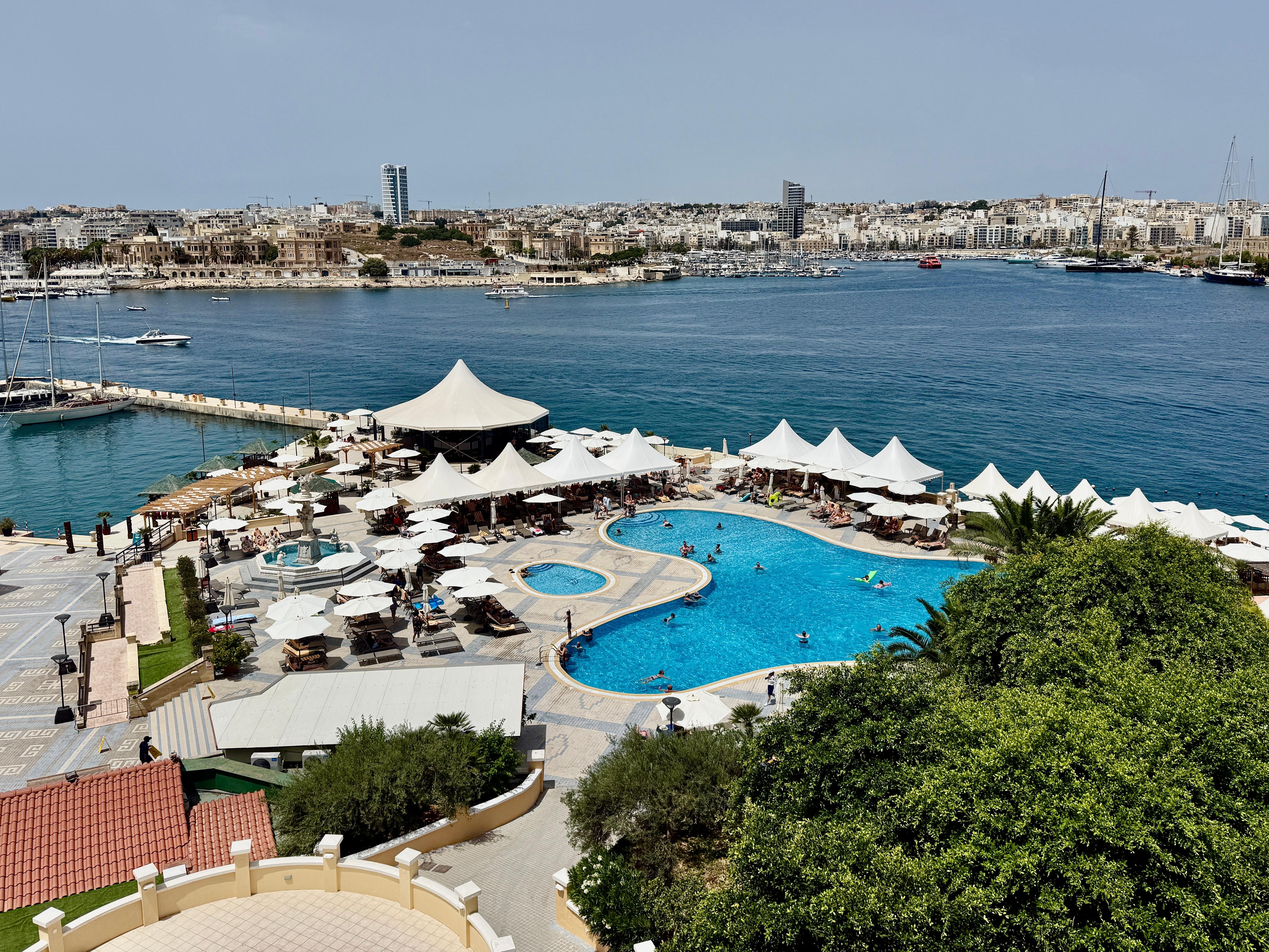 Great hotel with huge pool and private beach both with plenty of chairs. Although the rooms are a bit dated the hotel is still so elegant. Its in a great position and they have daily free car/shuttle to valletta. Would highly recommend this hotel