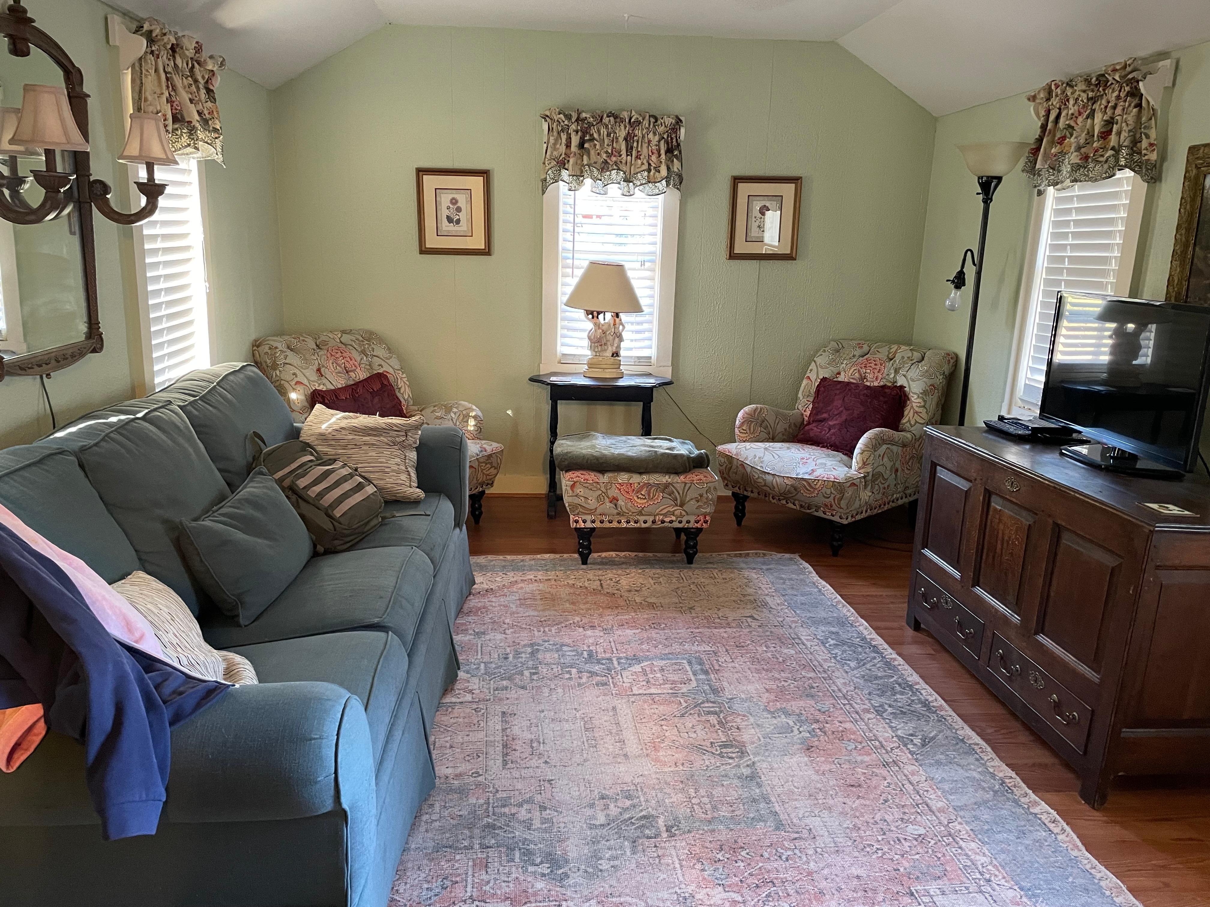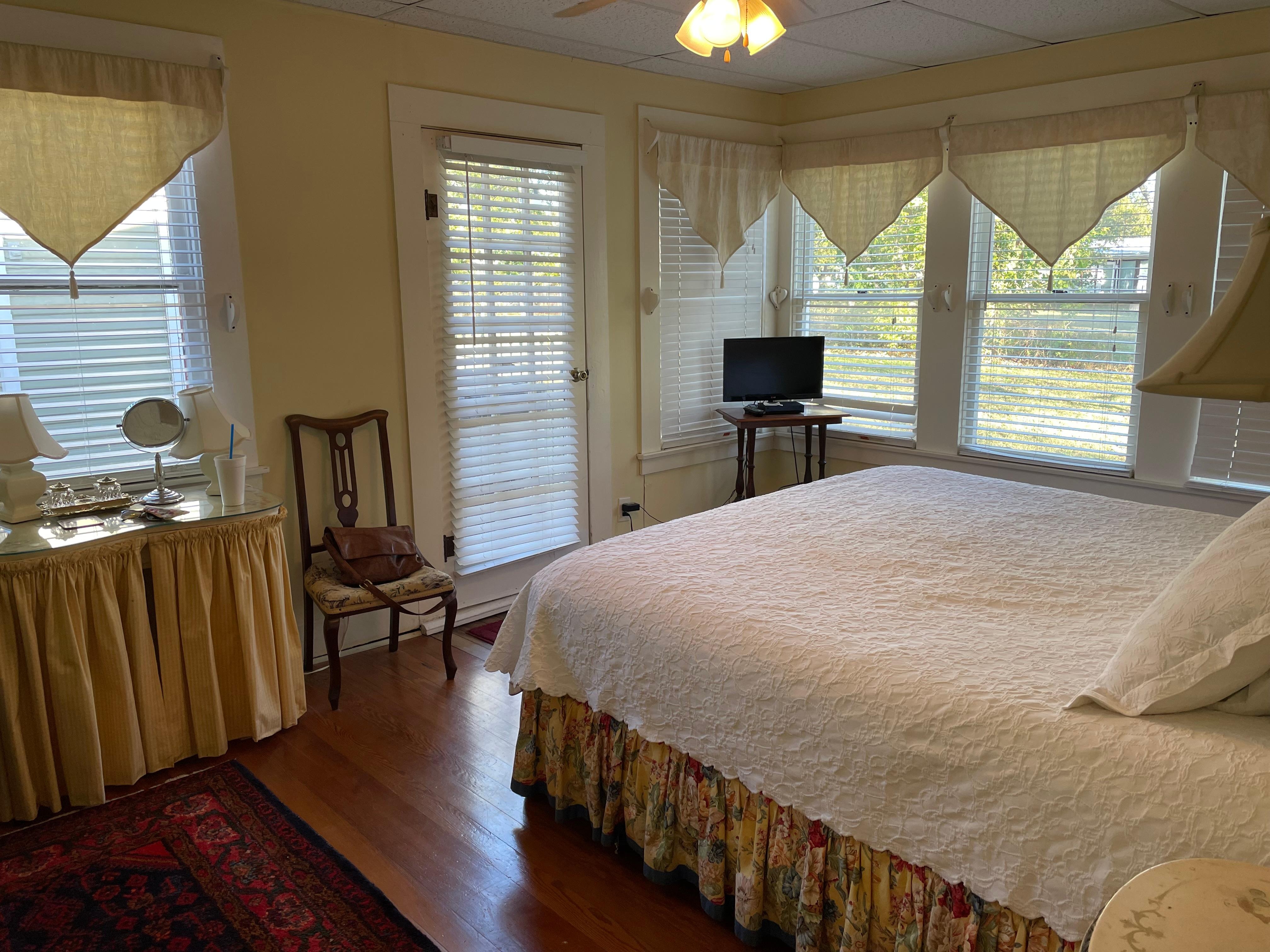 Holly's Haus is one of the few vacation rentals to offer two bedrooms, each with its own private bath. One bedroom is outfitted in cheery butter yellow and boasts an elegant king size bed with tufted headboard, a romantic vanity and, of course a TV in case you decide to catch a movie or the big game. The second bedroom includes another king size bed with beautiful bedding and soothing mint green walls. Each bedroom has its own private bath, one with a tub/shower and one with a shower only. Holly's Haus is the perfect place for a romantic, peaceful getaway just for the two of you. Or take advantage of the second bedroom and bath which make this an ideal retreat for two couples, a girls getaway or, well...you name it! You just can't go wrong making Holly's Haus your little piece of Hill Country heaven!