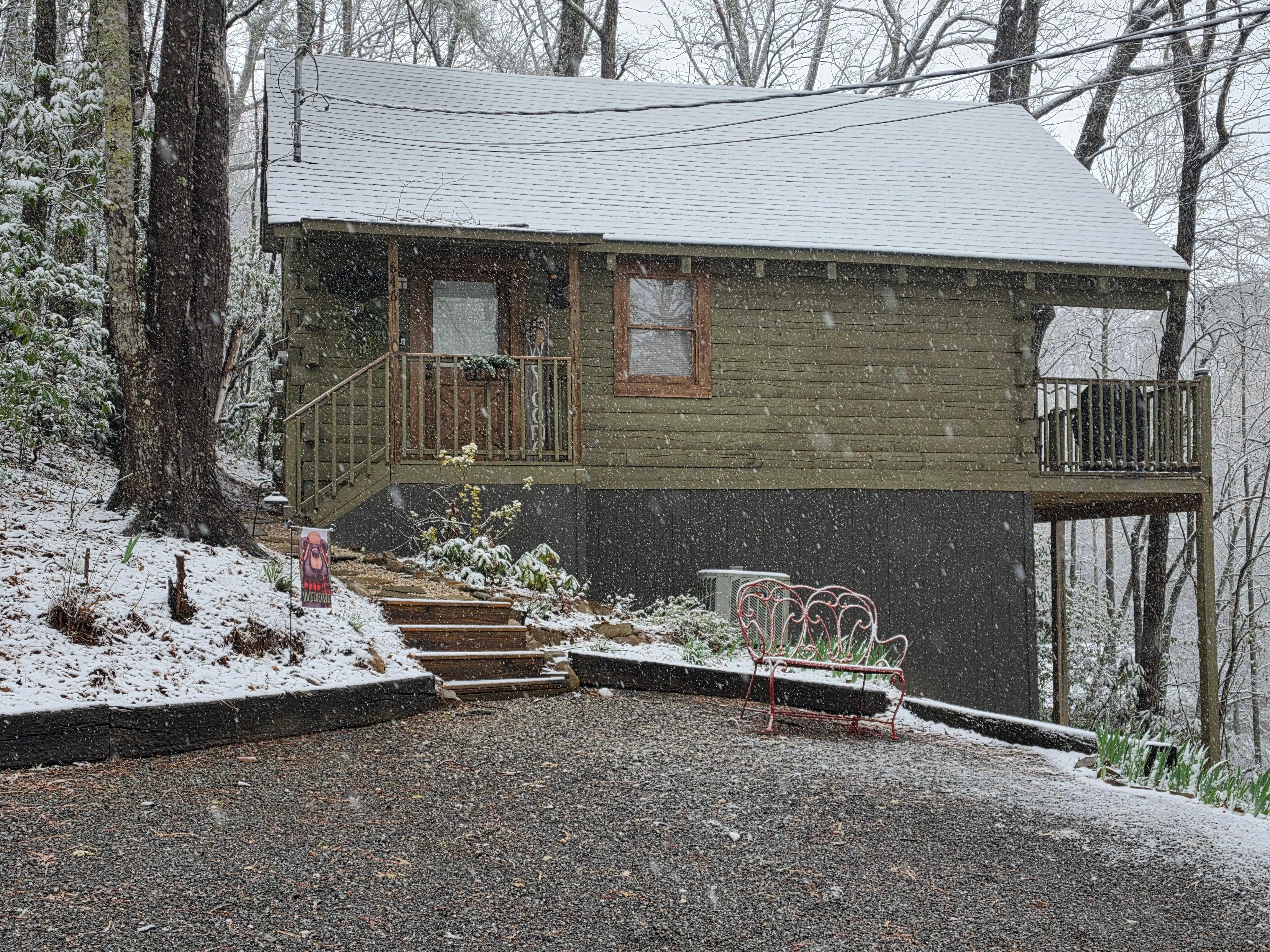 The cabin is very secluded and private, with lots of trees that surround the property. There is one Blink Camera installed at the entrance/driveway for your protection and ours. It also has a mountain view, not as great when leaves are out.. Private deck with large hot tub, pool table, wood burning fireplace, firewood provided in Winter months, big screen TV with cable and Roku, unique Bubbler Jukebox (decoration only, however the bubbler does function) Vizio sound bar added for music located on TV Stand, fully furnished kitchen and very romantic open loft master bedroom with king bed. Best of all it has a red heart shaped Jacuzzi that sits under a skylight and when you look up, you can see the stars and moon on a clear night.