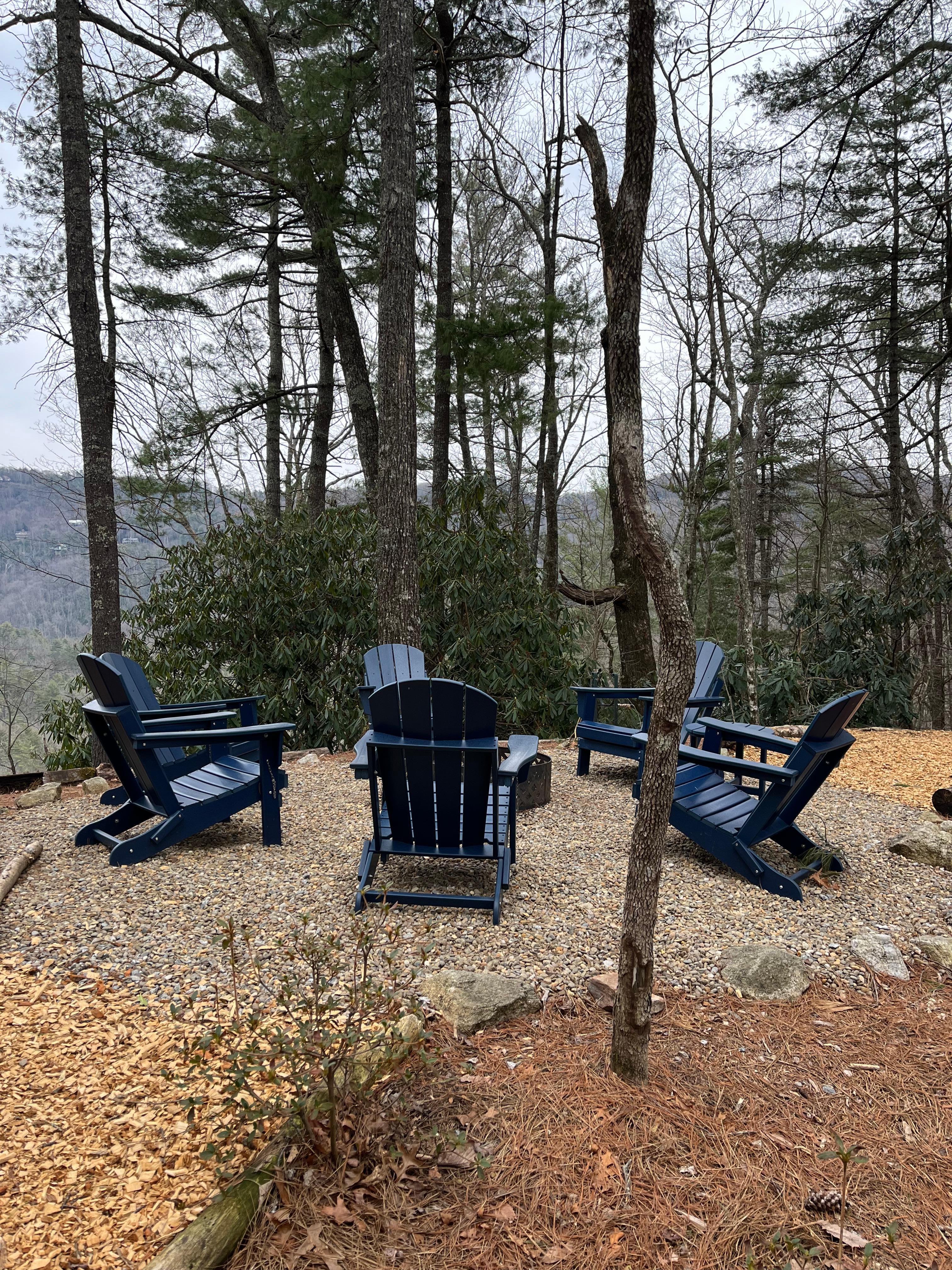- Firepit with six Adirondack chairs.