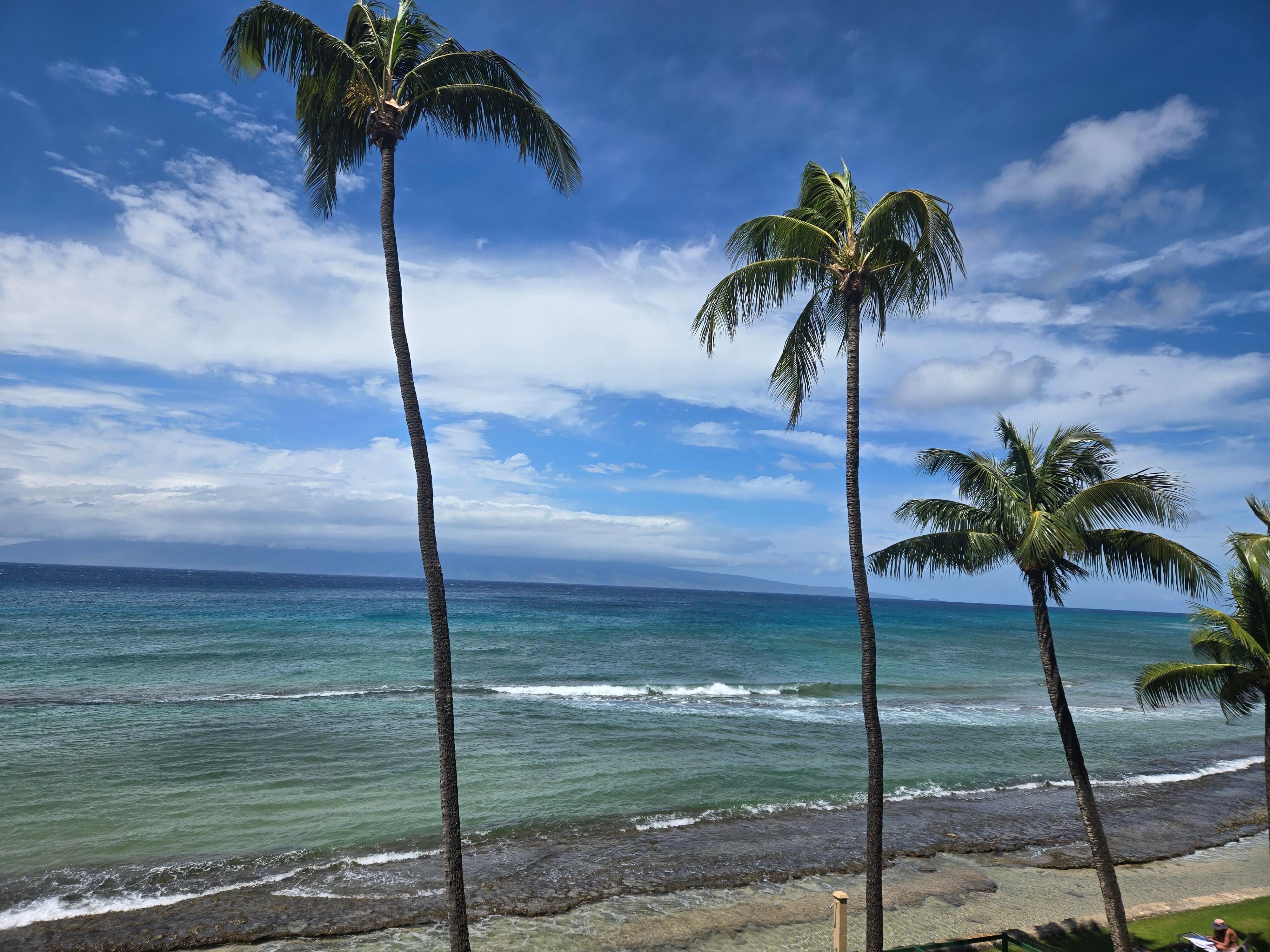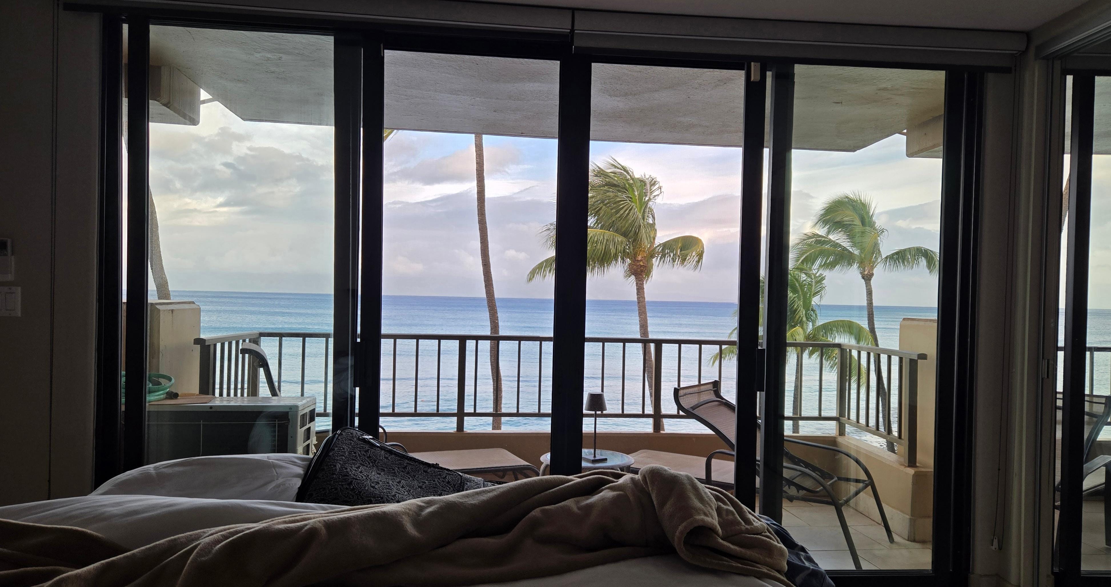 The living area is large and luxurious with a NEW OLED 65" flat screen SMART TV for direct access of your favorite apps & shows, just sign in. HD TV is offered as well. A large area for all to enjoy viewing for everyone - TV, ocean, stellar sunrise/sunsets, sailing vessels & the island of Molokai. Lighting, ceiling fans, dining area and bar counter top are all accessed in this super comfortable LARGE LIVING space for relaxing or step out the 15ft sliding doors and enjoy the Lanai #1 for more amazing sights of the grounds, shore, our 2 snorkeling reefs and the island of Lanai'i. Most likely you'll find you will not need the AC and are able to have the doors open to enjoy the ocean sounds! The West Maui trade winds and ocean breezes are free and flowing. Your unit also includes complimentary dedicated in room 5G WIRELESS internet during your stay. Sit back, relax open the lanai doors and enjoy the ocean breeze! The direct center oceanfront view from both the living room lanai, and also the master bedroom lanai are wonderful for relaxing.