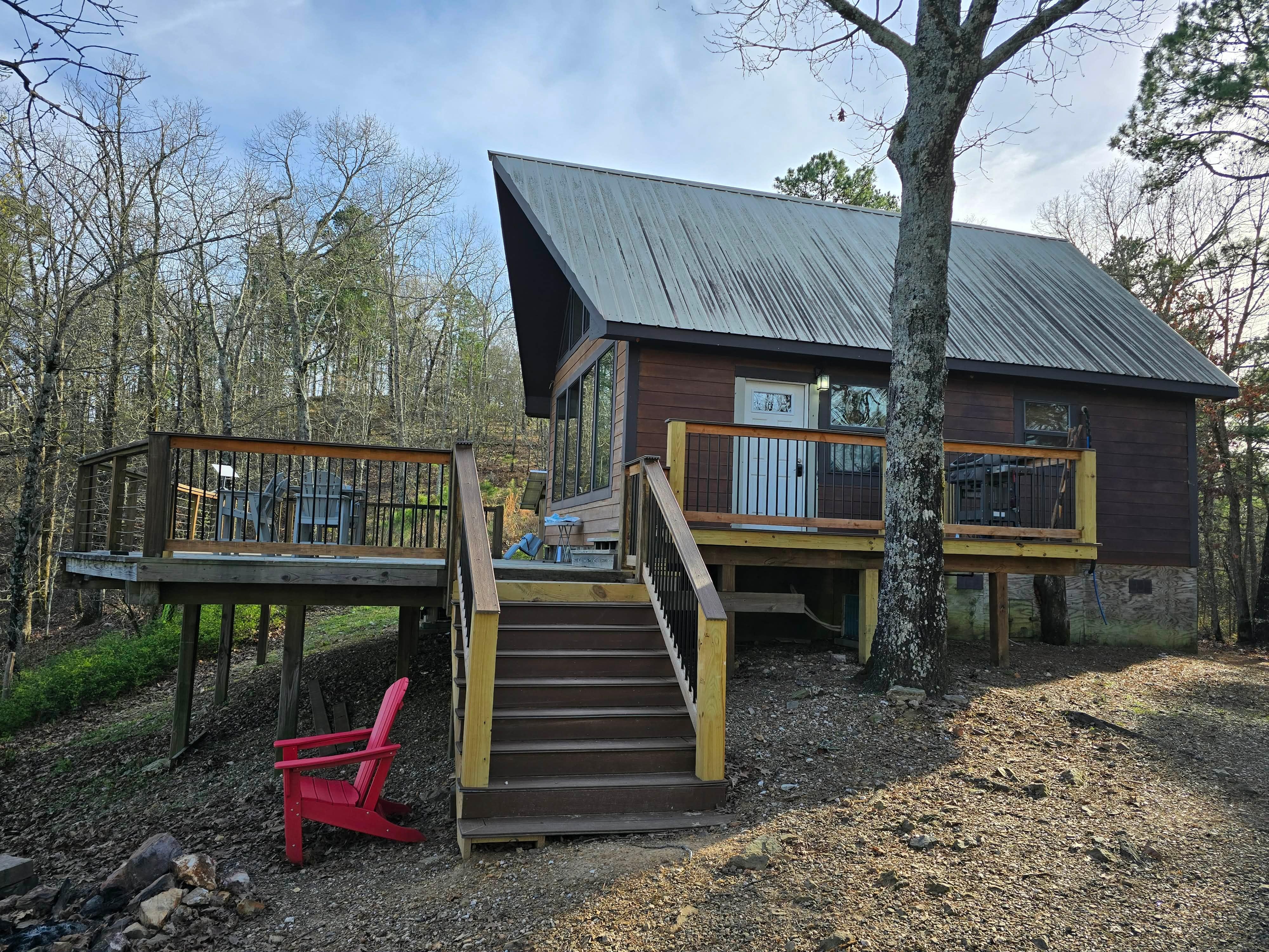 Because of its location, not only will you avoid extra town taxes and fees upon booking, but The Cliffhouse also provides an incredible retreat from hustle and bustle of the big city. You get the best of both worlds! This 1,000 square foot cabin sits atop a mountain on 80 acres overlooking Broken Bow Lake. Being surrounded by 6,000 acres of National Forest and US Corp of Engineer land provides unparalleled hiking, mountain biking and bird watching right from your doorstep. The 600 square foot deck faces the lake and has incredible panoramic views.