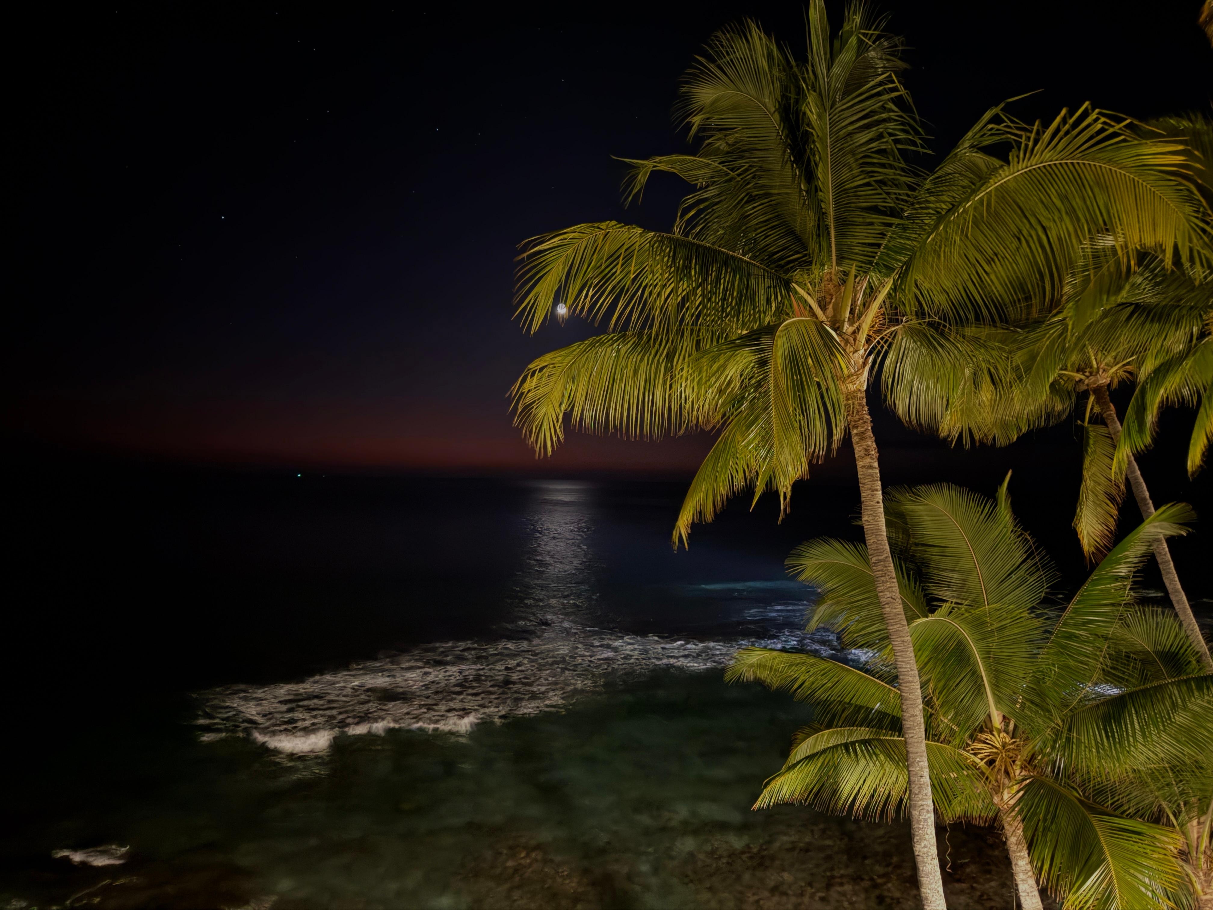 This desirable air-conditioned oceanfront penthouse unit (with elevator) features spacious open beam ceilings and is only 30 feet from the gentle surf lapping directly below the lanai, where surfers launch into the spectacular blue waves of Banyans Beach, one of Kona’s most popular surfing spots. This beautifully remodeled and furnished condo features an oceanfront living room and master bedroom with unparalleled 180 degree ocean views and access to spectacular Kona sea life and sunsets. Your cares dissolve away as warm sun and soothing surf caress your mind and body on the wood-grained tile lanai in your lounge chairs. Enjoy the brilliant blue skies, colorful Hawaiian reef fish, green sea turtles, Humpback whales, spinner dolphins and surfers right from your lanai. In the quiet evening, relax on your lanai and experience the amazing reds and oranges of a spectacular Kona sunset as the huge orb descends into the sea through the softly waving palm fronds. Luxuriate in the remodeled master bathroom and shower with multiple shower heads, double sinks and contemporary tile work. The beautiful wood-grained tile floors, well stocked kitchen with granite countertops and contemporary cabinets and upscale Hawaiian-themed furnishings will make you wish you never had to leave. During the day, slide the 12’-wide doors between the master bedroom and living room into the wall pocket to enjoy an unrestricted panoramic ocean view from throughout the living area. At night, leave the lanai doors open in the oceanfront master bedroom and living room and be lulled to sleep by the ceaseless caress of the waves on the worn lava rocks below. Gentle ocean breezes keep you cool day and night whether snoozing on the lanai, entertaining friends in your oceanfront paradise or sleeping soundly in your king-size bed.