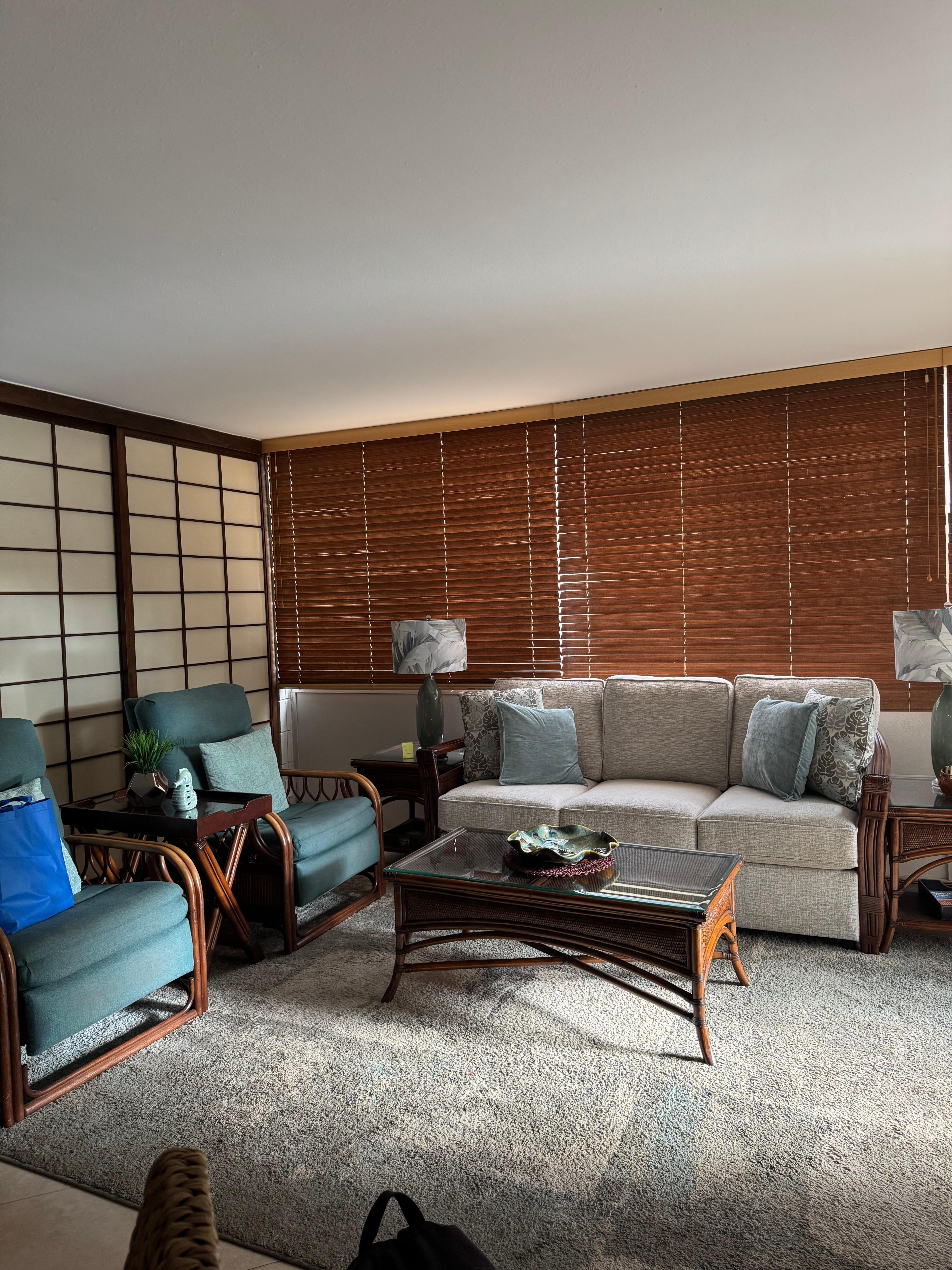 The kitchen has recently been remodeled featuring granite countertops. It is well- stocked with a variety of cooking utensils to meet all of your needs. The living room/dining room is spacious and well-appointed. Large shogi screens divide the living room from the second bedroom providing privacy when closed and spaciousness when opened.