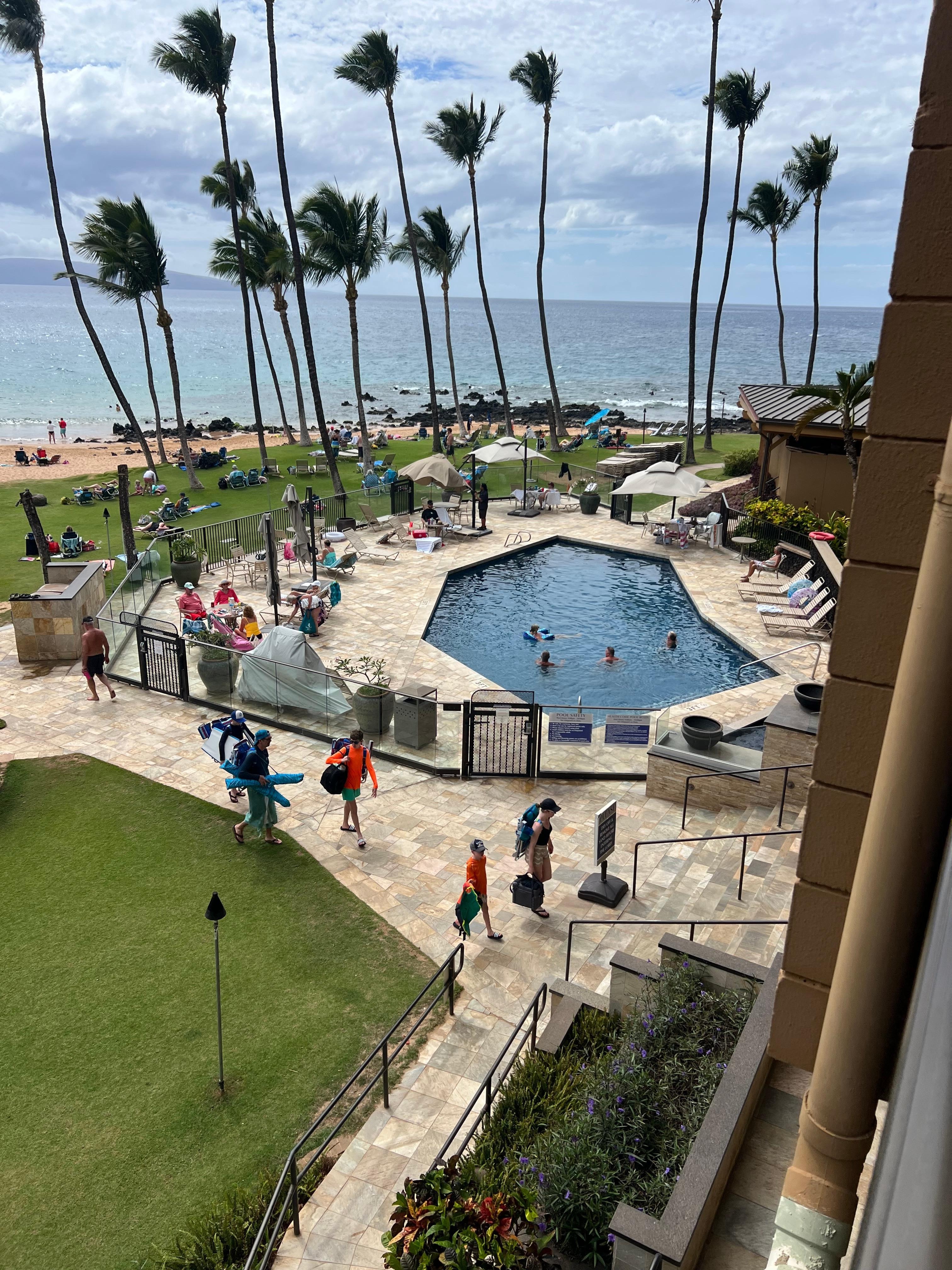 Really enjoyed the ability to walk right out and have the beach, water, a grassy area, the pool and a shower for rinsing off right there. Also, nice to sleep with sliding doors open, and fall asleep to waves crashing. The unit needs some updating, especially the balcony furniture. Didn' spend much time inside.