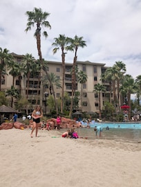 An outdoor pool and a hot tub are on site. Other recreational amenities include a lazy river and a fitness center.