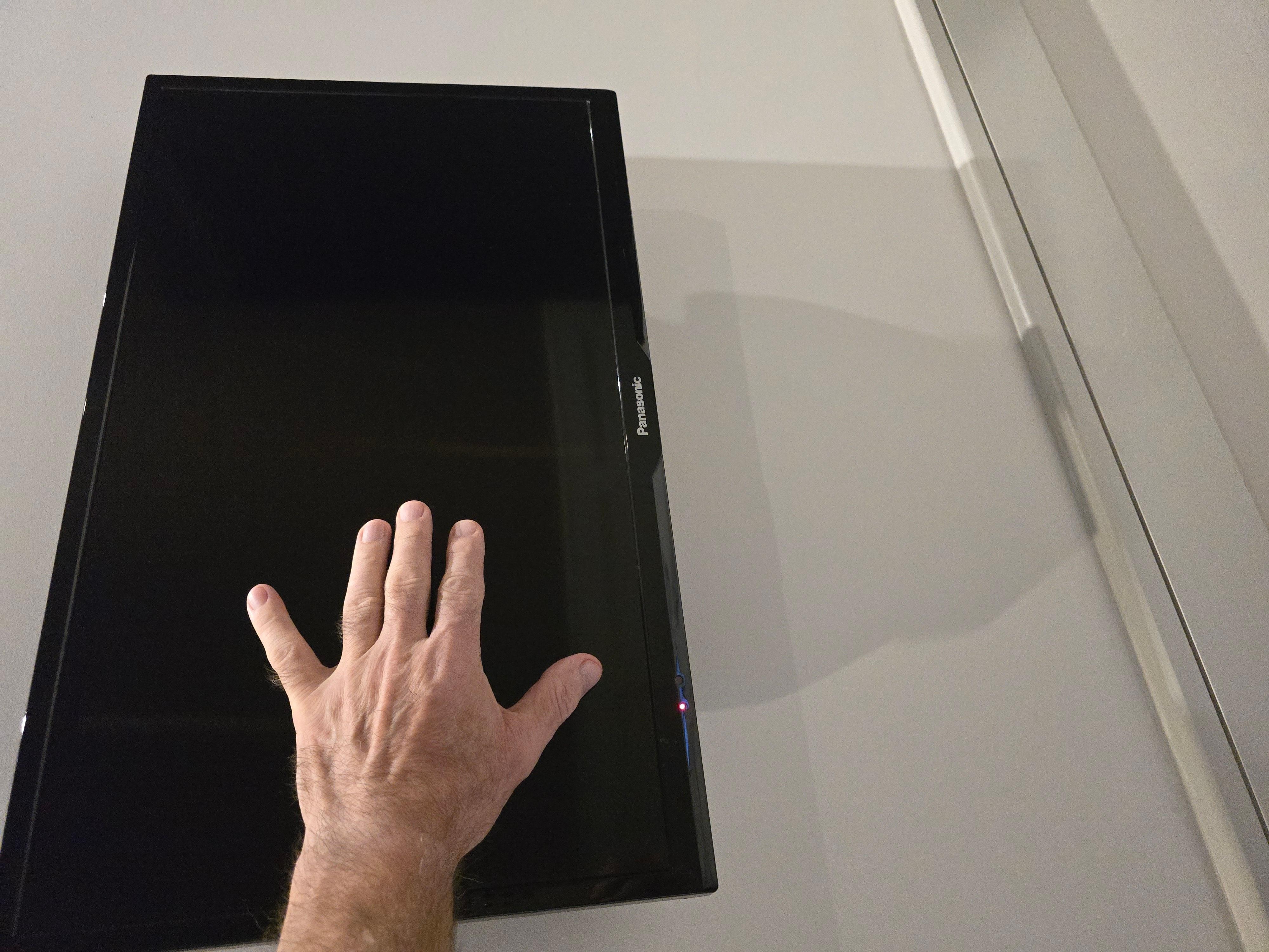 There was no comfortable chair, just a foot stool which I was unable to wear. Nice carpets in hallways but not so nice in the room. Holes in bedding, and worst of all, the tiny television screen. For context the photo has my hand touching the screen. I could not only see the screen when on the bed. I also needed to be very careful not to knock the tv off the wall when I walked (sideways) past the bed because the space between the bed and the wall was only about 5 or 6 inches. Most painful indeed for me to do because of my disability.