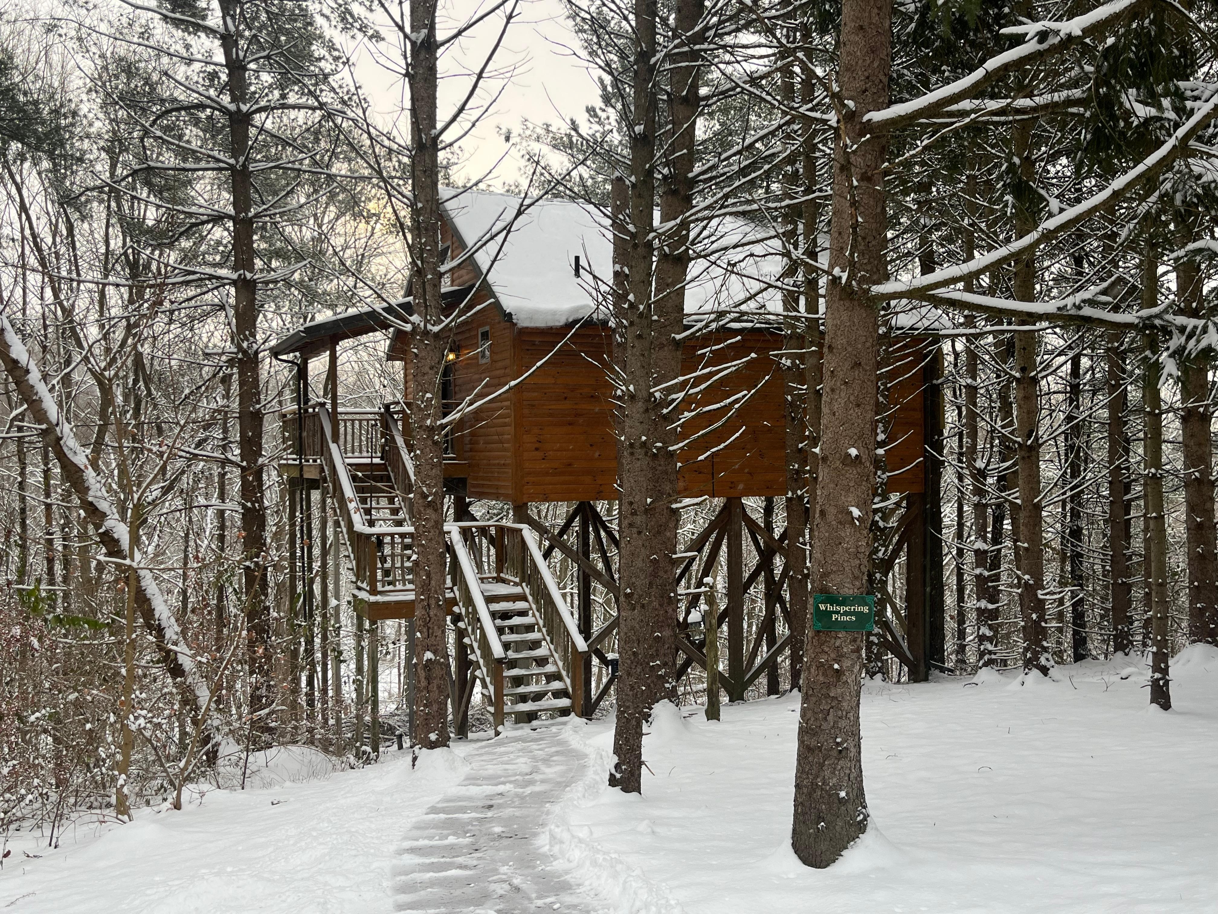 Enjoy breathtaking and one-of-a-kind lodging in our Whispering Pines Treehouse. This unique treehouse rental in Ohio towers 22 feet in the air and offers luxury, adventure, and comfort. Featuring a stone two-person jetted tub with a ceiling tub filler, king-size rustic Amish Crafted pillow-top mattress, cherry hardwood floors, and rustic furnishings. Privately tucked away in a grove of White Pines, relax and refresh yourself while sitting on your deck.