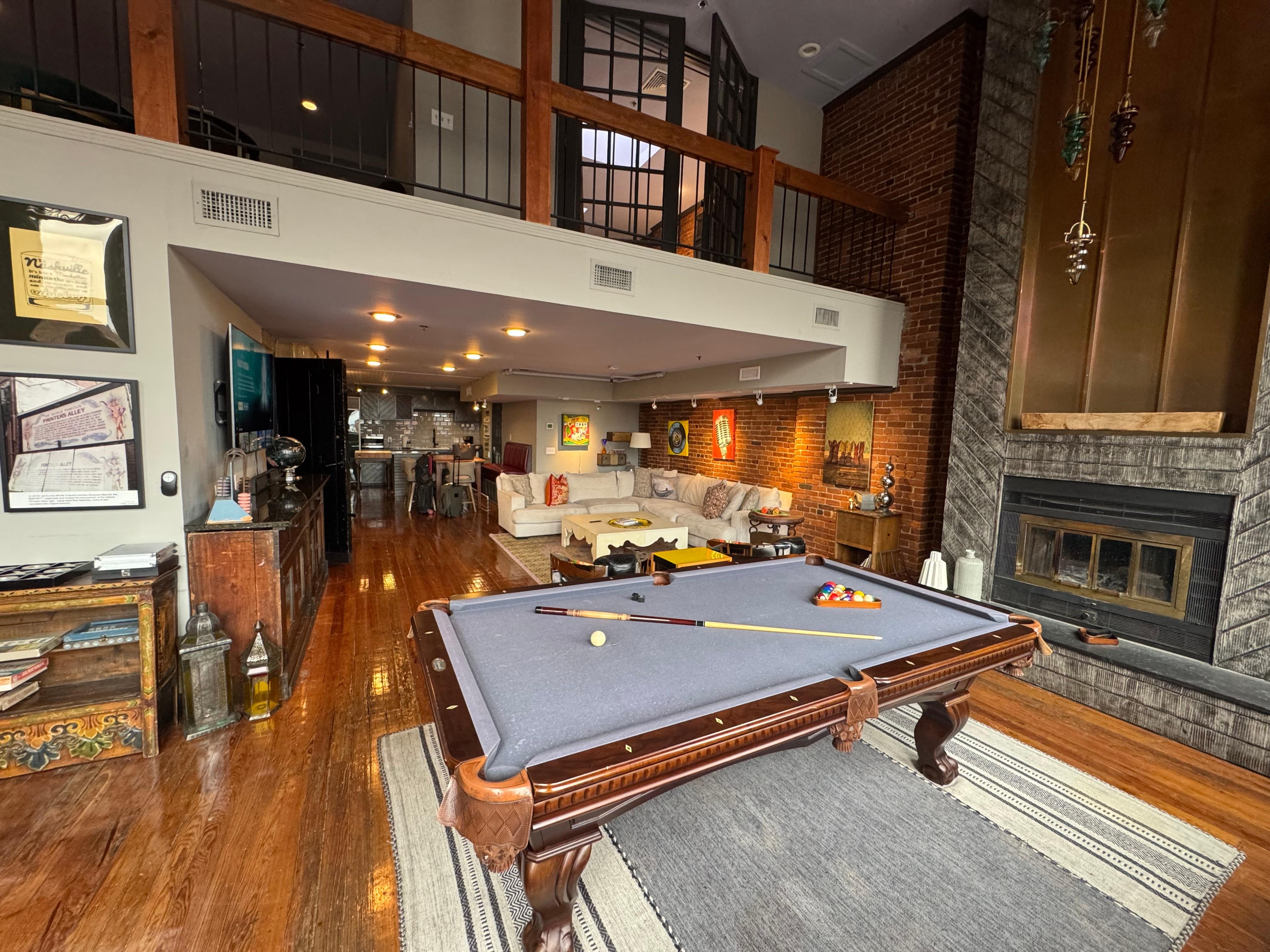 ☆ The open living and dining areas flow into a fully equipped chef’s kitchen, while a stylish fireplace adds warmth and charm. Upstairs, a pool table transforms the loft into the perfect entertainment hub.