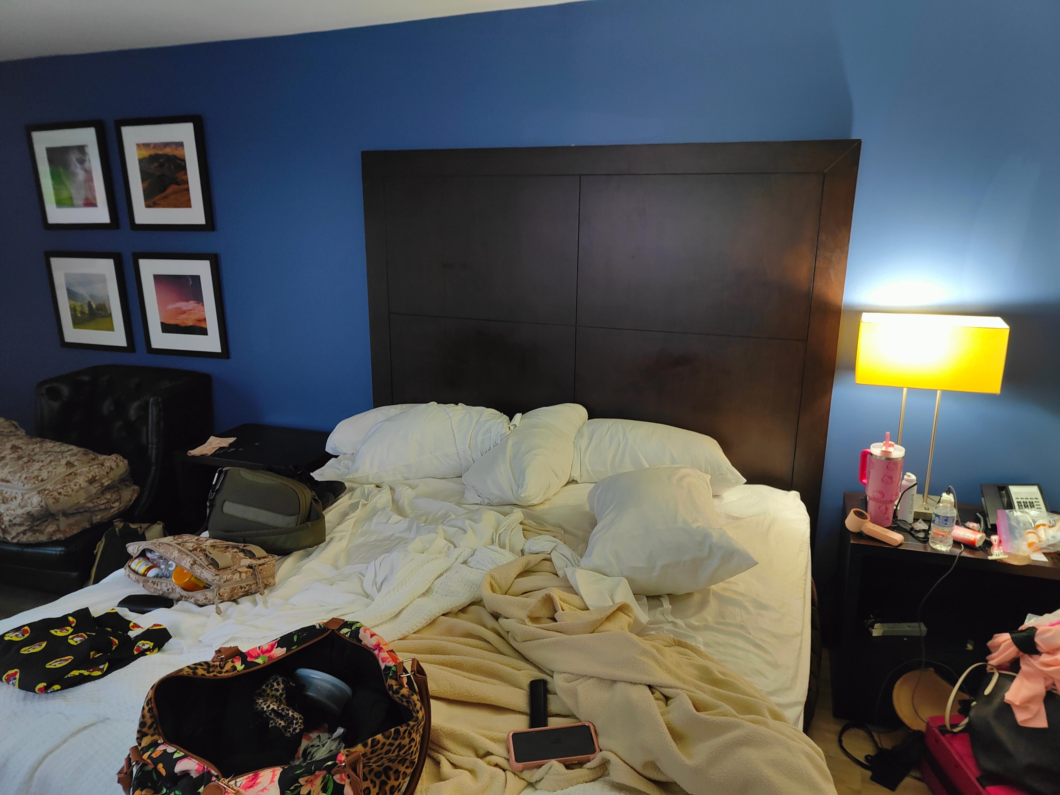 The room was disgusting and hadn’t been cleaned it appeared. Found no small towels that were clean but one was hanging over the shower with public hair in it. The surge protector was filthy, ashes and dust on the dresser night stand and table. The hallways were filthy. Sink in bathroom was clogged up. Stains on floor in bed room area.