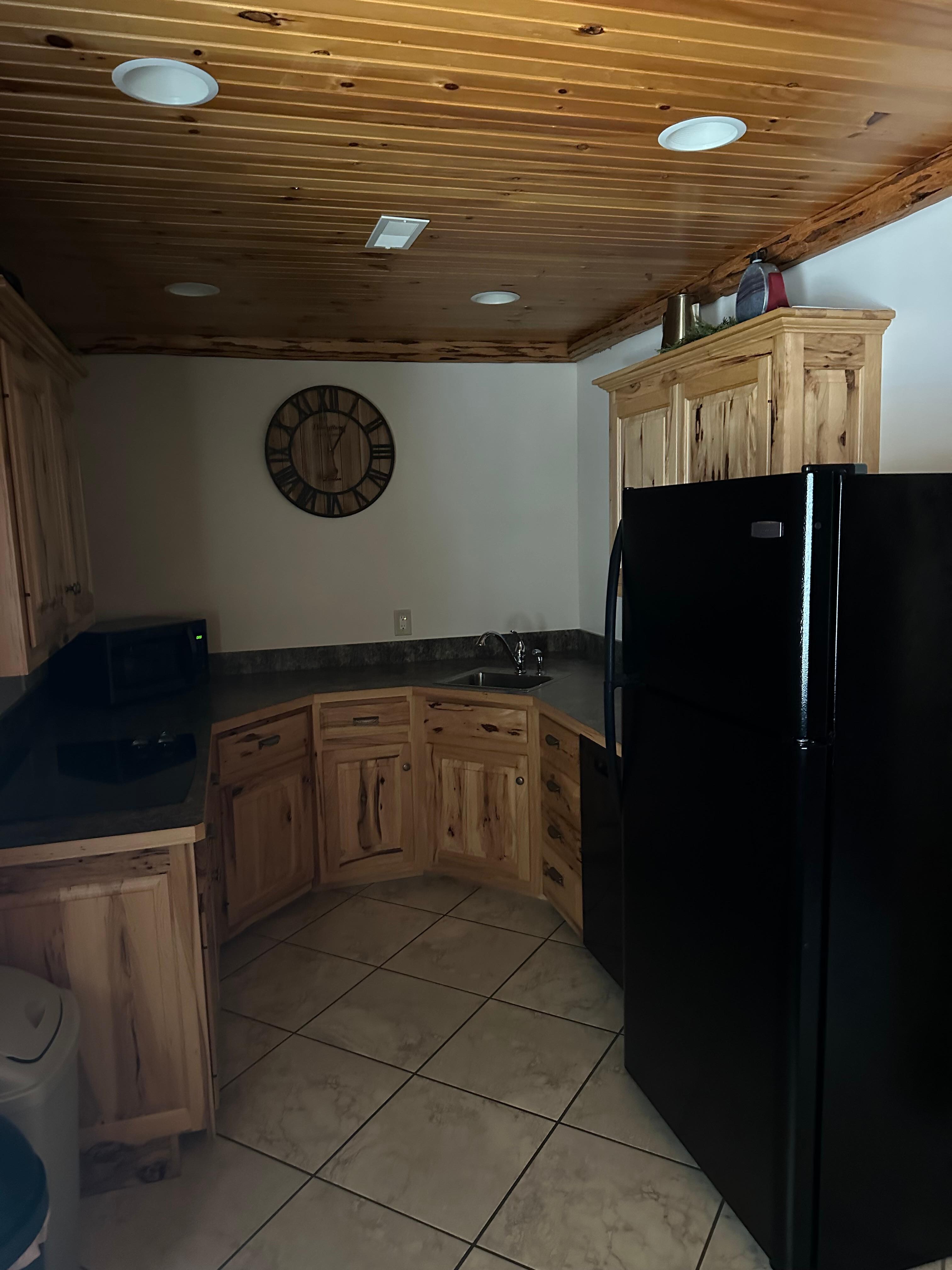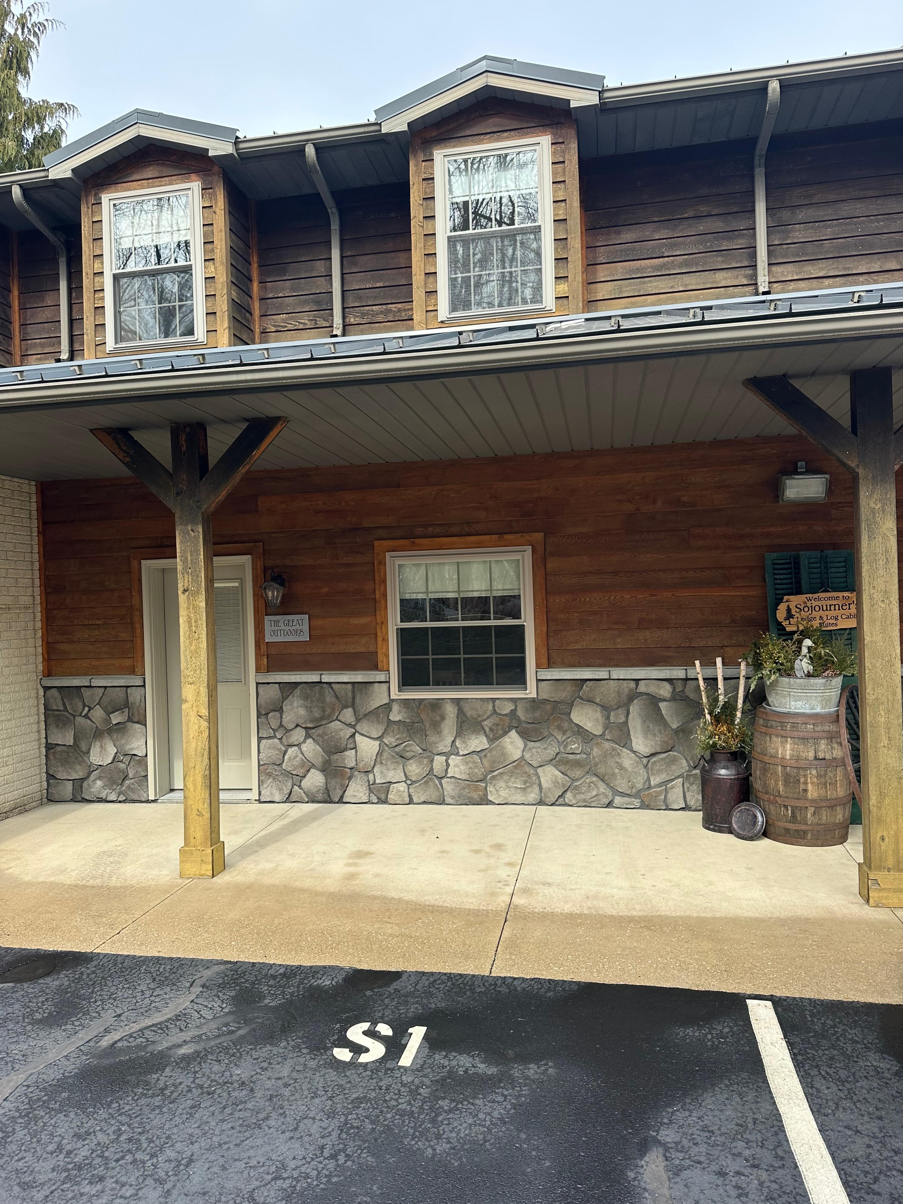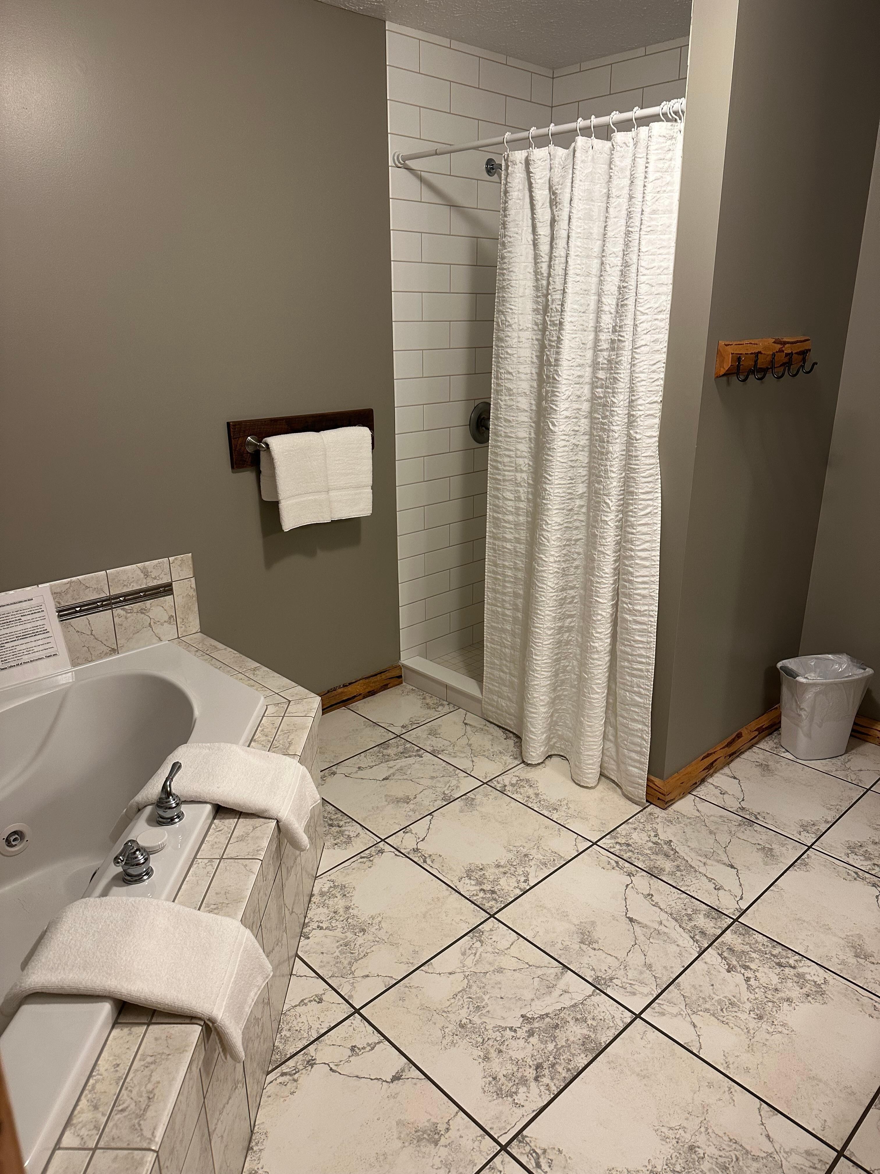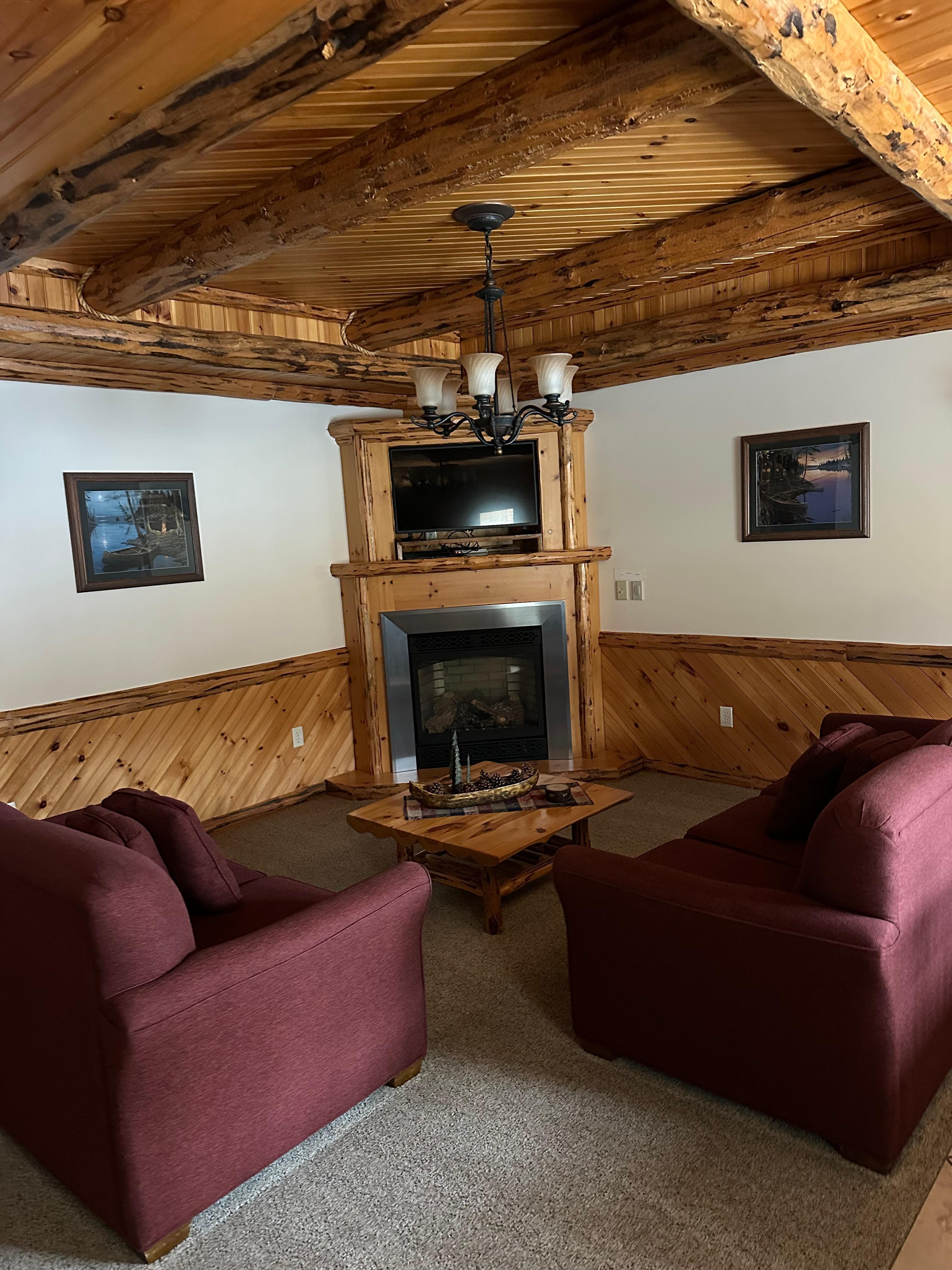 A spacious lodge suite that celebrates the beauty of the great outdoors. This well-appointed two-bedroom suite invites guests inside with the warm, earthy tones and the cabin décor. Relax in the open living room with gas fireplace and TV, enjoy meals with the full kitchen, get a restful night’s sleep in the two private master bedrooms each with a queen bed, and soak your cares away in the Jacuzzi for two in the bathroom, which also features a walk-in tiled shower.