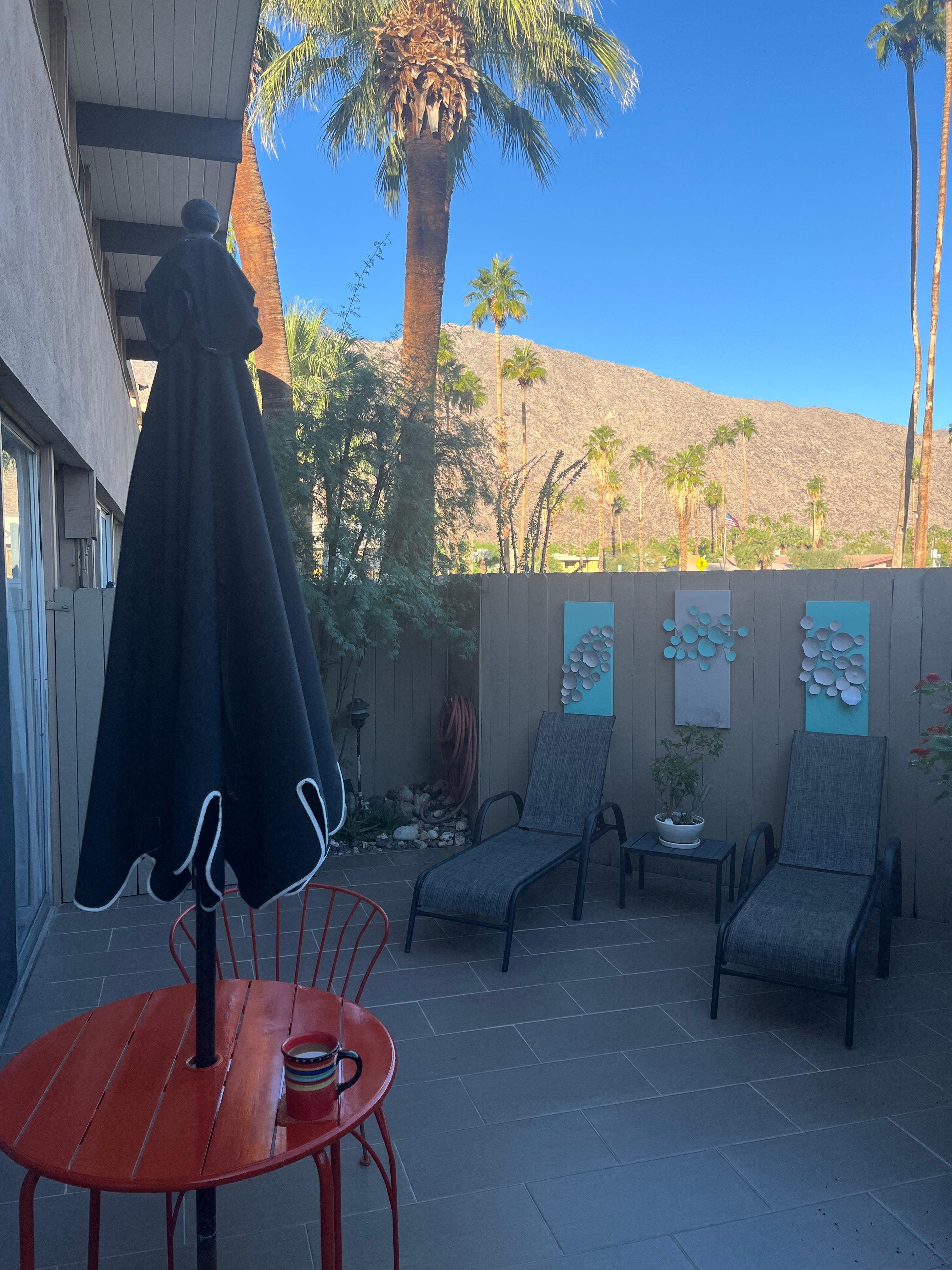 Situated near the NE corner of the complex along William Krisel Way and East Palm Canyon Drive, this 1 bedroom ground floor condo enjoys a private patio larger than most all other units, and is just steps away from parking, making entry and exit much more convenient. If privacy, discretion and VIEWS are important to you, then this is the unit for you!