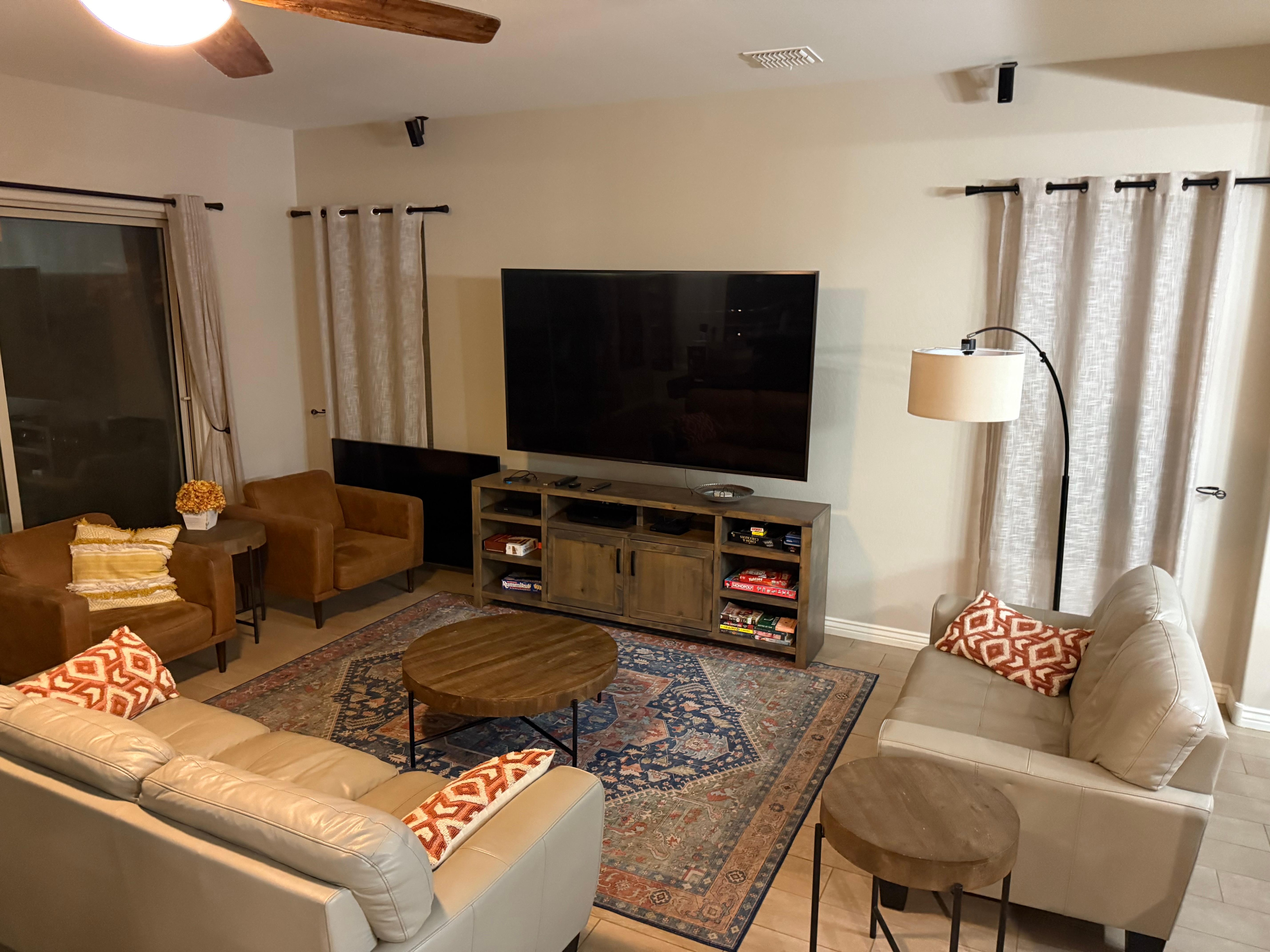 This home is beautiful! We had a small group of friends meet here, and it fit everyone's needs. The bedrooms and living space were clean and comfortable with extra bedding, pillows, and towels. The board and table games were a nice add too. The kitchen made the house perfect. We like to cook and anything you could ask for was in this kitchen...even a juicer! We went to a spring training game and hiked on a nearby trail. The group hung out in the backyard area with the pool, hot tub, and fire pit. There was plenty of outside seating space for our group. Highly recommend this home!