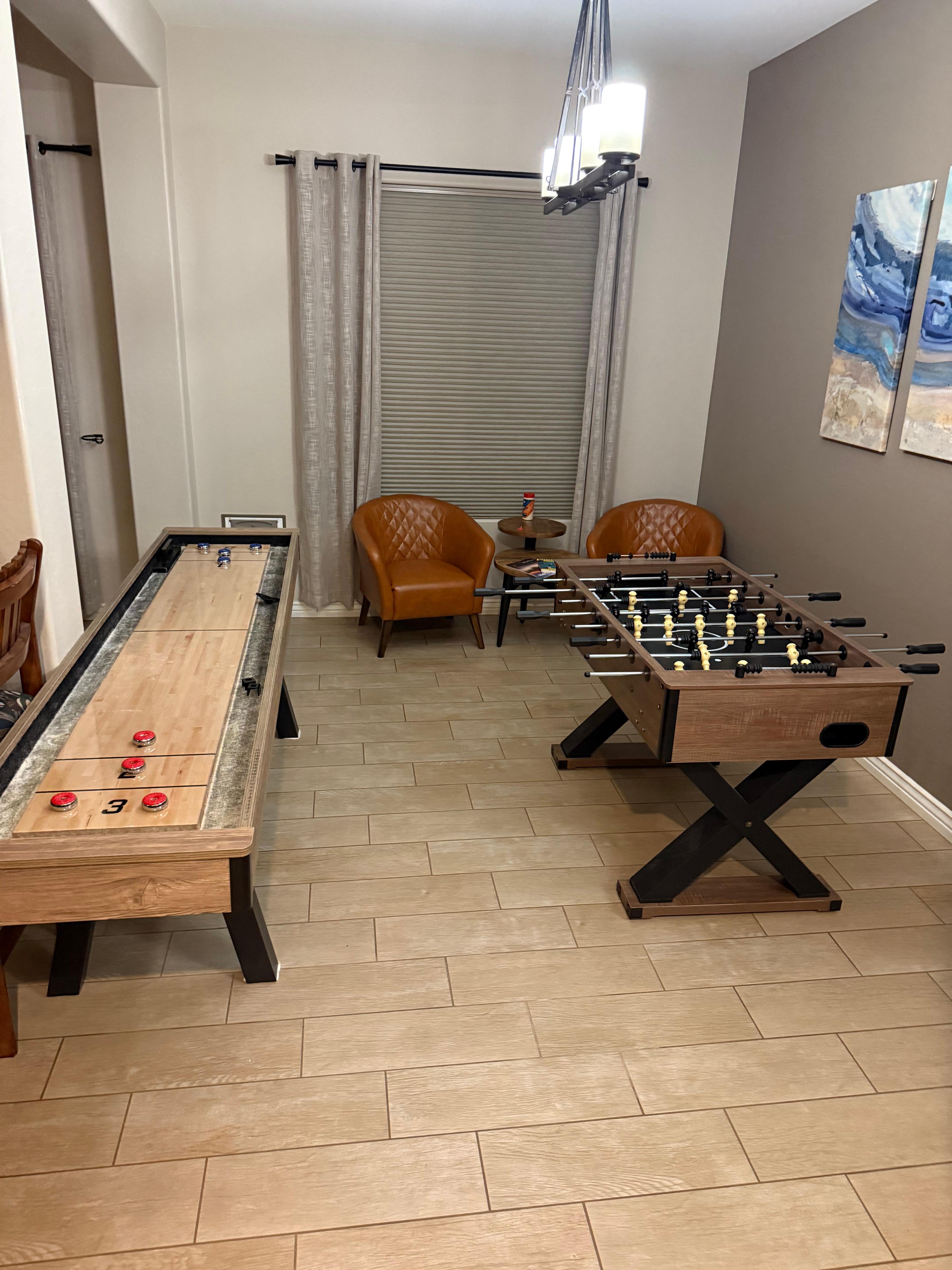 Gather in the cozy great room to watch the large smart TV, plan your next outing or play pool on newly added pool table. Large sliding doors add natural lighting and permit access to the patio and pool deck. Adjacent and open to the great room is a game room with foosball and air hockey tables. Game room seating gives onlookers the chance to cheer for the winners. Wifi is complimentary.
