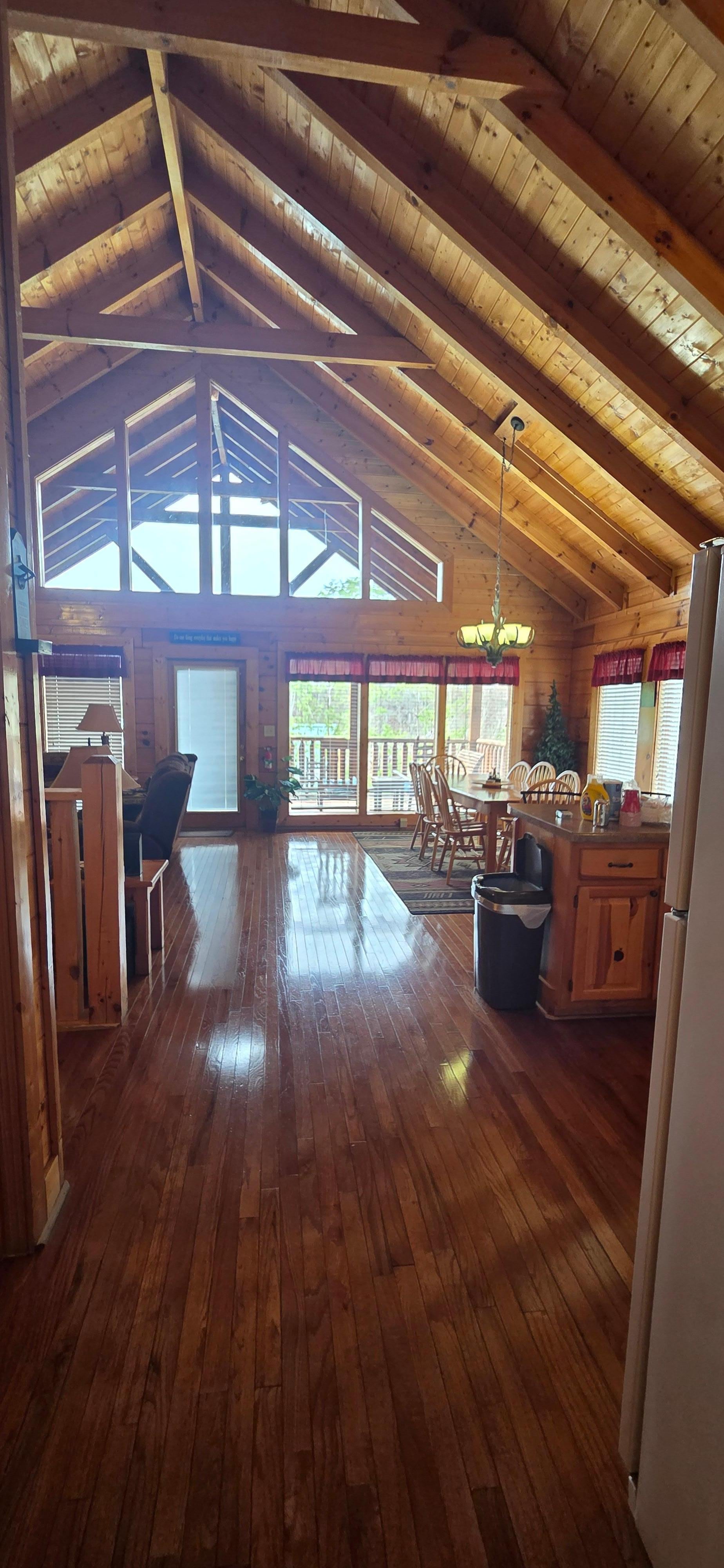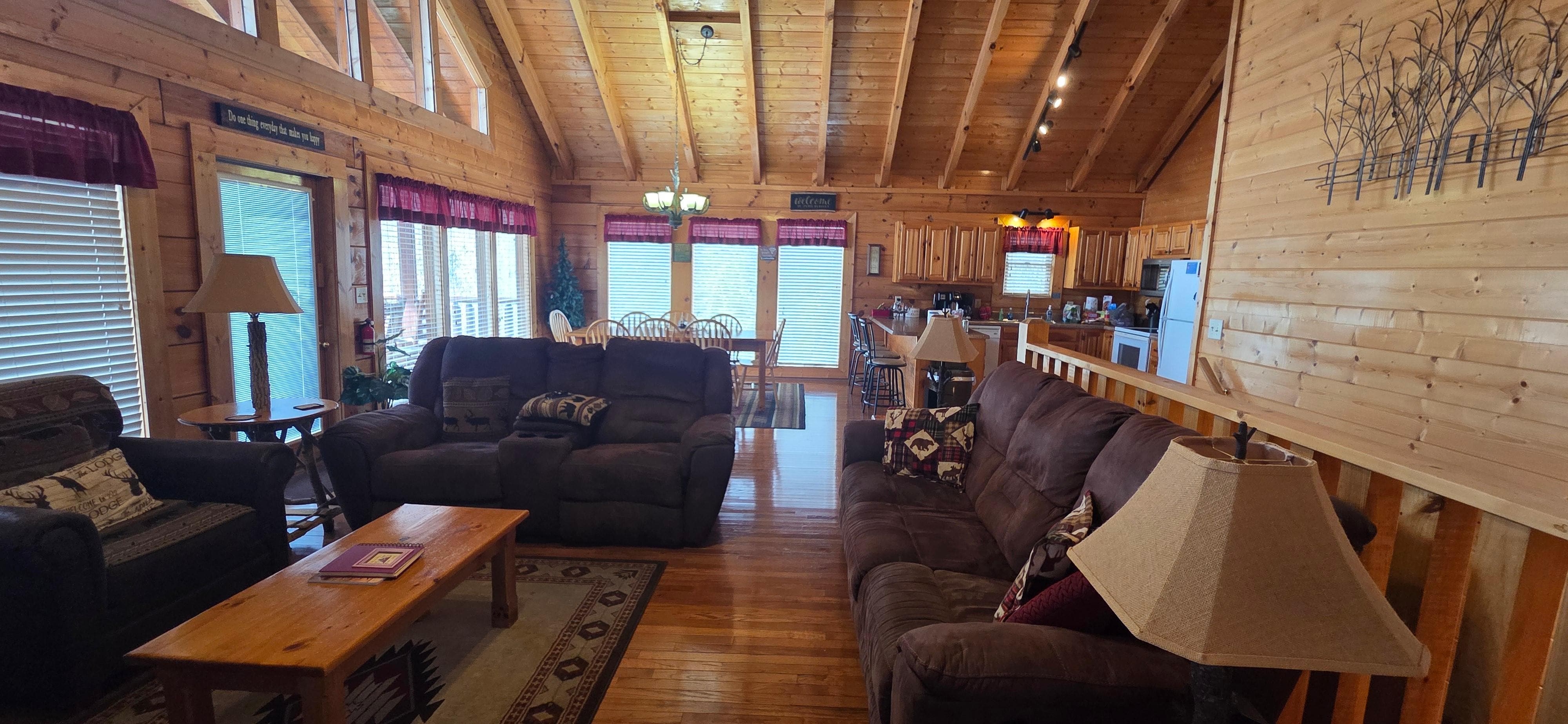 When you enter the cabin, the first thing you'll notice is the open floor plan with the living area, dining area and kitchen all open to each other. The ceilings are all tall, cathedral ceilings. The back of the cabin is all windows, allowing for lots of natural light and lovely views from the cabin.