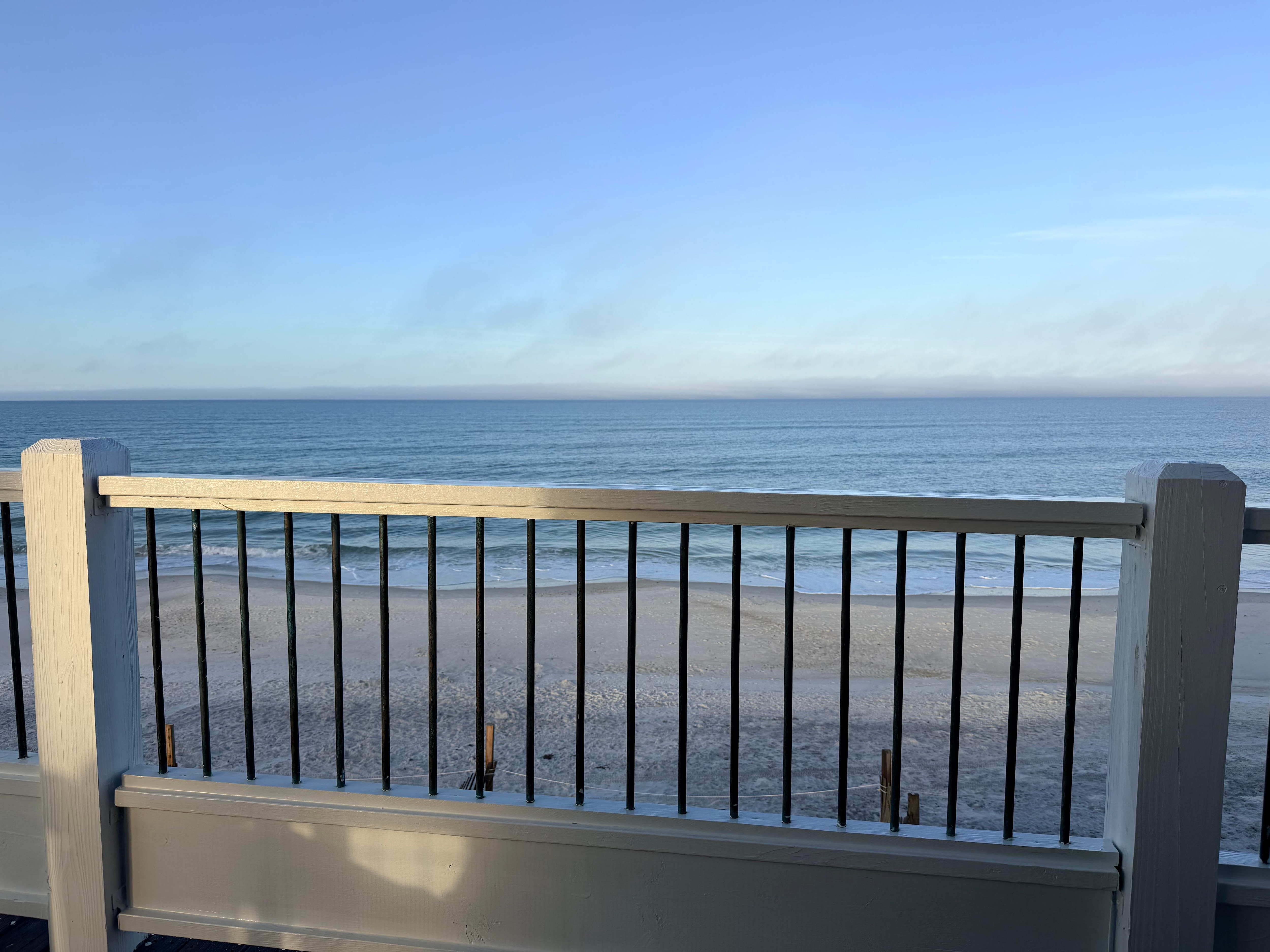 Stairs lead to a deck with incredible beach views, comfortable chairs, and an alfresco dining table to enjoy sunset meals. Stepping inside, guests will find pale laminate floors and an open living, dining, and kitchen area with beautiful views. A sectional sofa surrounds a 42†Roku TV and double sliding glass doors that open to the deck, which has tables and chairs. Hanging barn doors off the living area open to a guest bedroom with a queen bed. A light and bright kitchen features granite countertops and a breakfast bar that seats 2. An adorable dining nook has built-in seating with beach views and a dining table that seats 8. Down the hall is a bunk room with a twin-over-twin bunk bed and a guest bedroom with a king bed that share a bathroom. The primary bedroom has a king bed and a private bathroom.