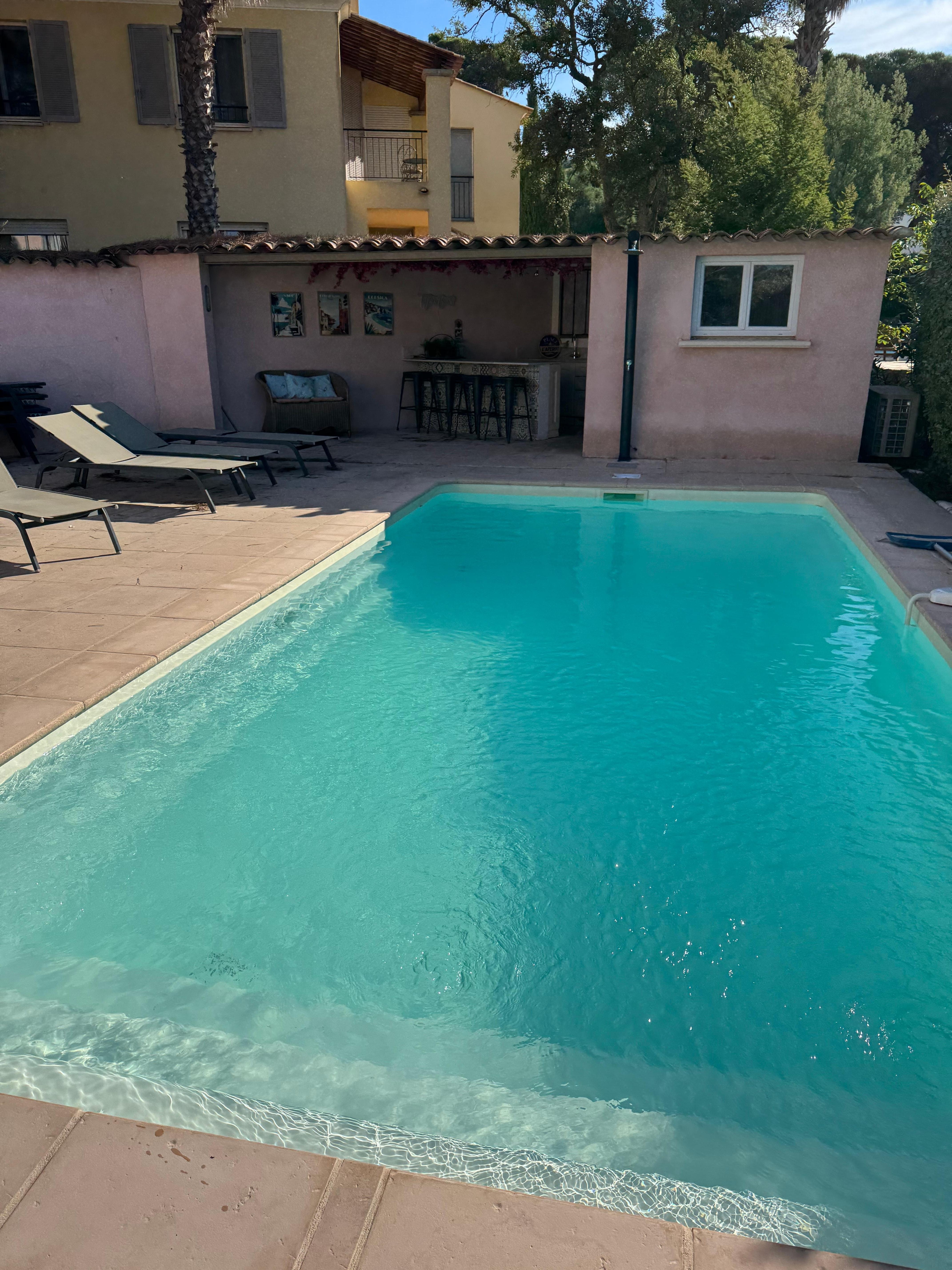 A beautiful modern, fully air conditioned, 4 bedroom, 4 bathroom, villa with private salt water pool and hot tub spa. We have recently added a poolside bar/kitchen area with drinks fridge. Guests also have access to large communal pool in a safe private gated domaine 200m walk from the villa. The villa has all modern amenities and perfectly situated 10 minutes walk from beautiful beaches and Les Issammbres marina, shops and restaurants. During summer there is a regular boat taxi service to St Tropez from the port of Les Issambres via Bateaux Verts, timetable can be found below. LES ISSAMBRES is a 10 minute drive from Sainte Maxime and array of restaurants and bars.