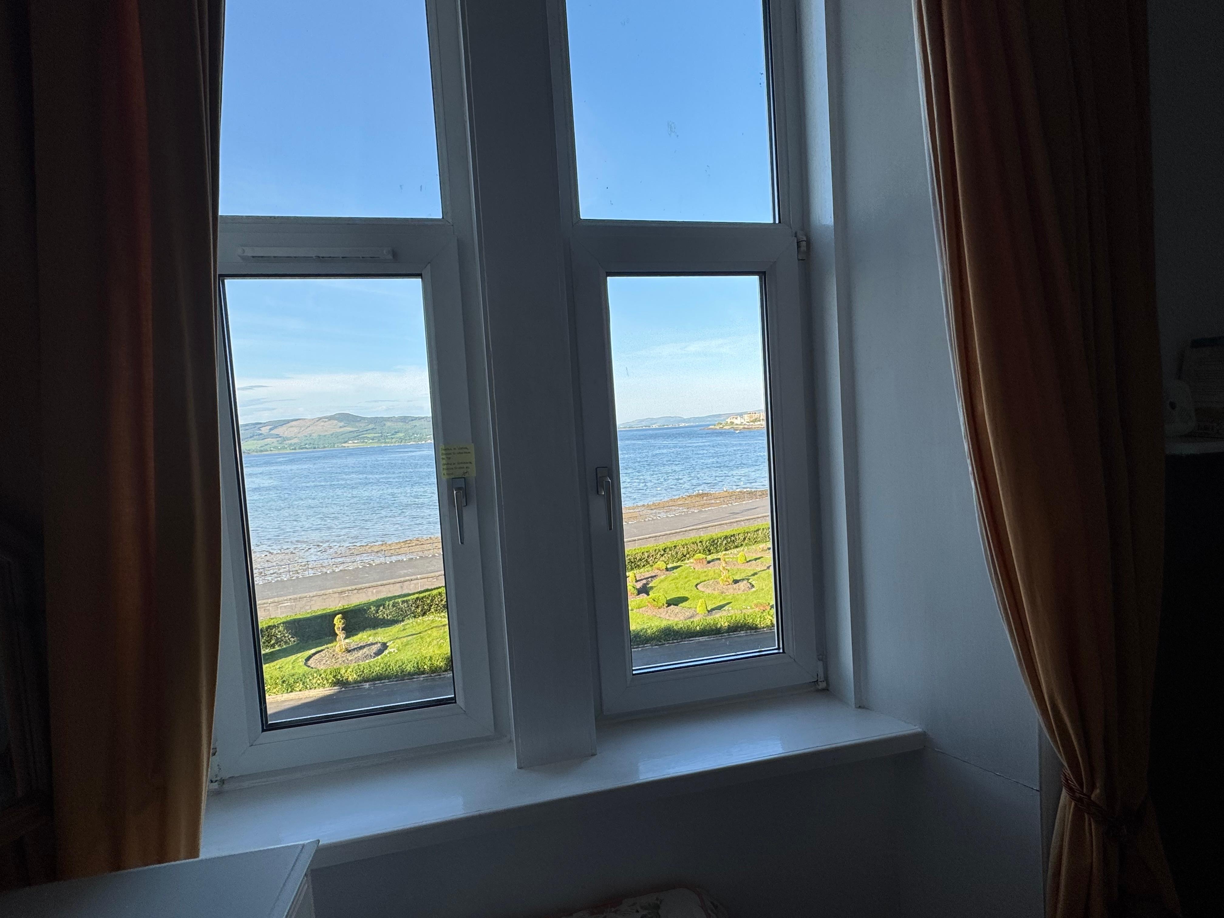 There are two bedrooms, one to the front with a kingsize bed and lovely views over the whole bay, and another with twin single beds. The flat sleeps 4 people comfortably with a fold up bed for an extra person if needed.
