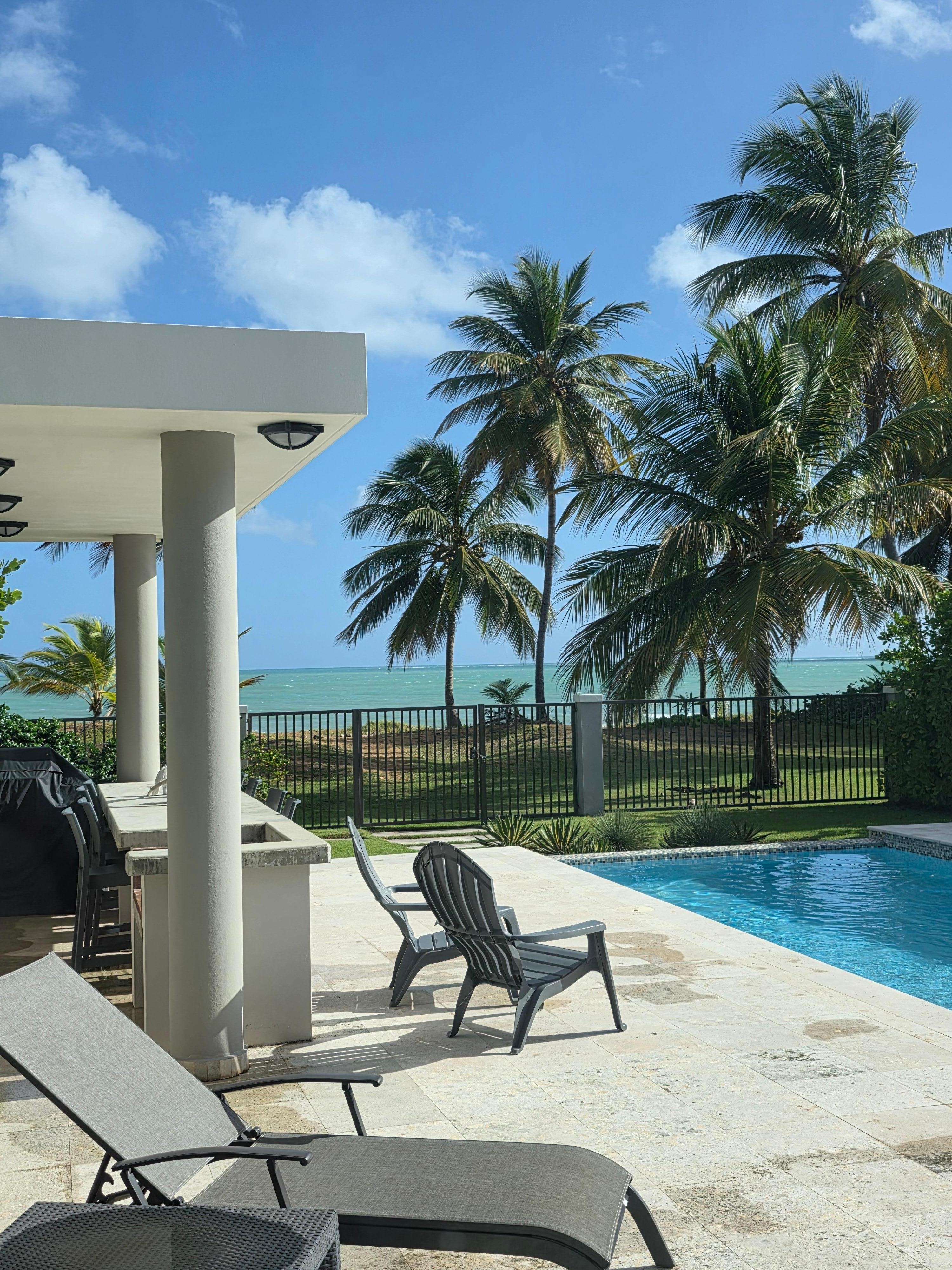 It is our pleasure to offer you a little bit of paradise in our privately owned beachfront home Villa "Besos Zalados" (translated to Salty Kisses). This beautiful 3 bedroom 4.5 bath vacation home overlooking Las Picuas Beach is located in the gated community Ocean Forest in Rio Grande, on the northeast side of Puerto Rico, near the famous Wyndham Rio Mar Beach Resort. Spanning a little over 3000SF, this magnificent beachfront residence with its high ceilings and extensive windows will have you enjoying wonderful views from multiple vantage points. And let's not forget it's wonderful location with it's close proximity to an abundance of activities: golf, beach, pool, water sports, horseback riding, rain forest, restaurants, bars, and many many more.
