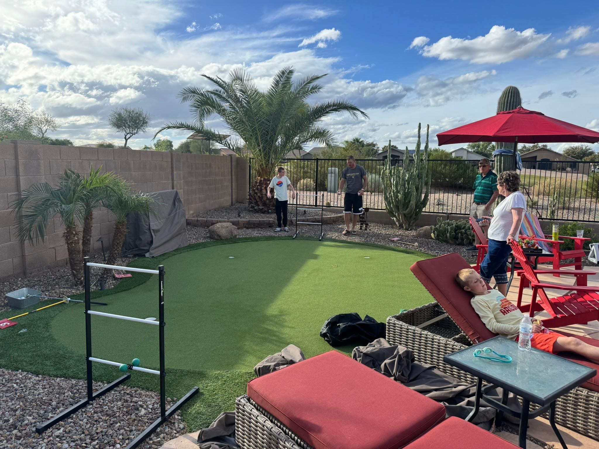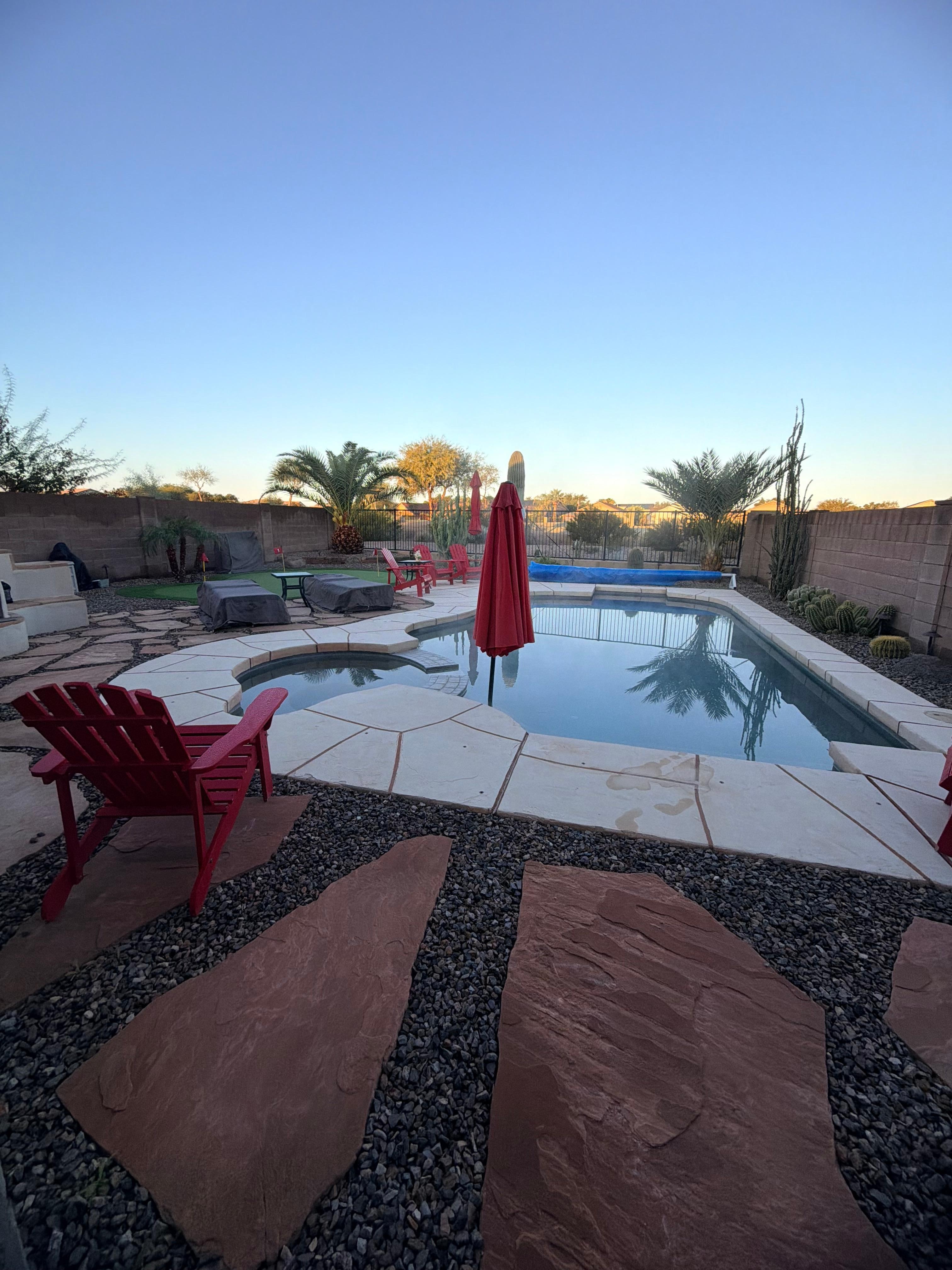 This place was 10/10 in every aspect! Communication: very responsive and so nice! House: very clean, beds were all comfortable, so many amazing touches like a bottle of wine and a handwritten welcome note on the table, a pile of games, a book that covers everything you would want to know about the property and the area, and so much more.Yard/pool: backyard is perfect for a family (or adults). The salt pool was always a nice warm 85, the hot tub was very relaxing, the putting green was a hit with our boys, the adobe fireplace was great for smores and the patio furniture under the covered patio was great for relaxing in the hot afternoon sun. Location: great area in Johnson Ranch and very quiet. So many great places near by.HIGHLY recommend this place for both adults and families with kids.