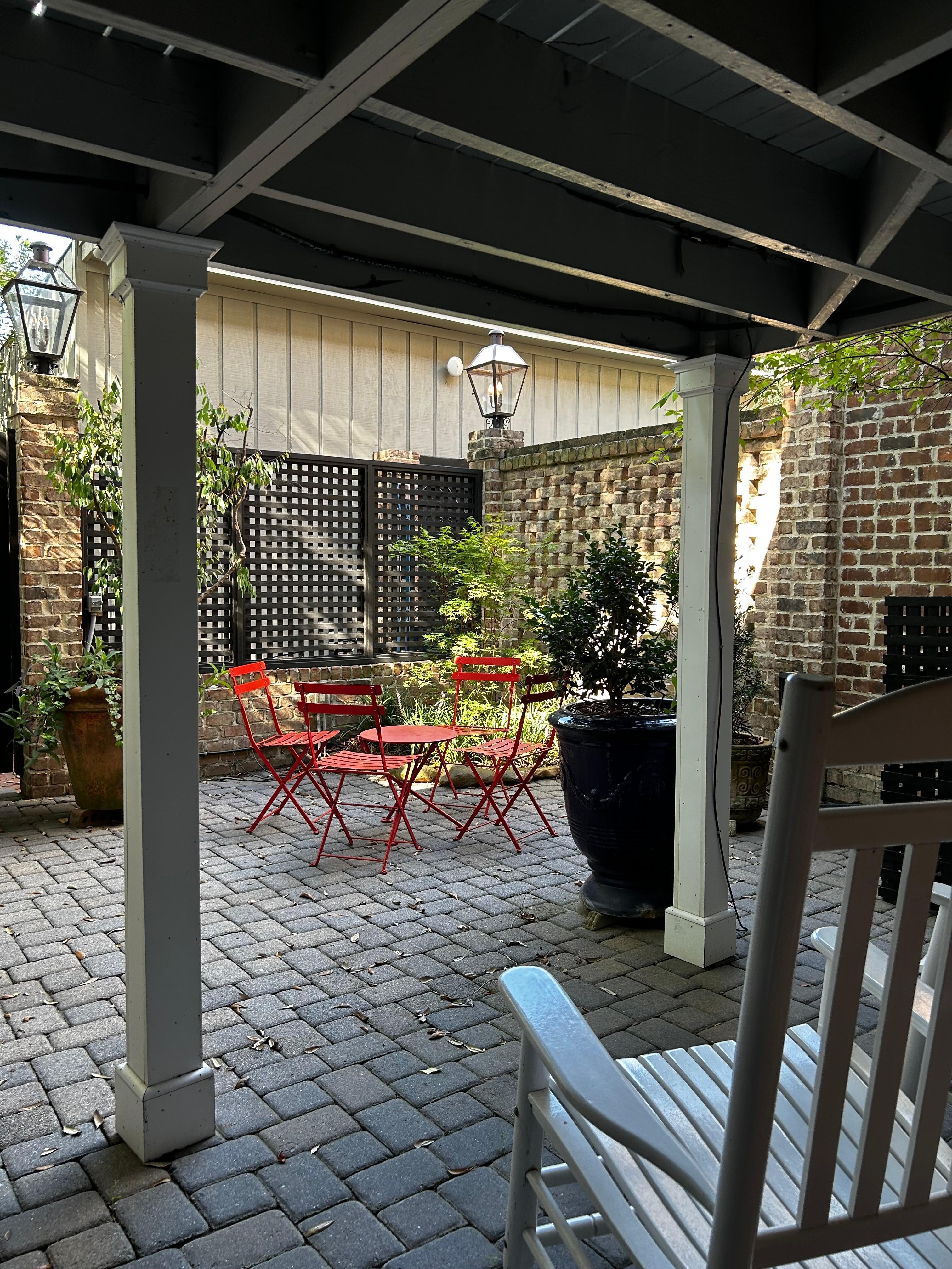 Walk into the main room of this property and you'll be greeted with wood flooring, a brick fireplace and lots of comfortable seating. Right around the corner is the full kitchen with stainless steel appliances and stocked with all the essentials. The king-size bedroom is roomy and well-appointed and you'll find an attached bathroom as well. Just through the bedroom you will find a door leading into the beautiful courtyard that is shared with the main house. This is a perfect spot to get some fresh air or enjoy a morning coffee.