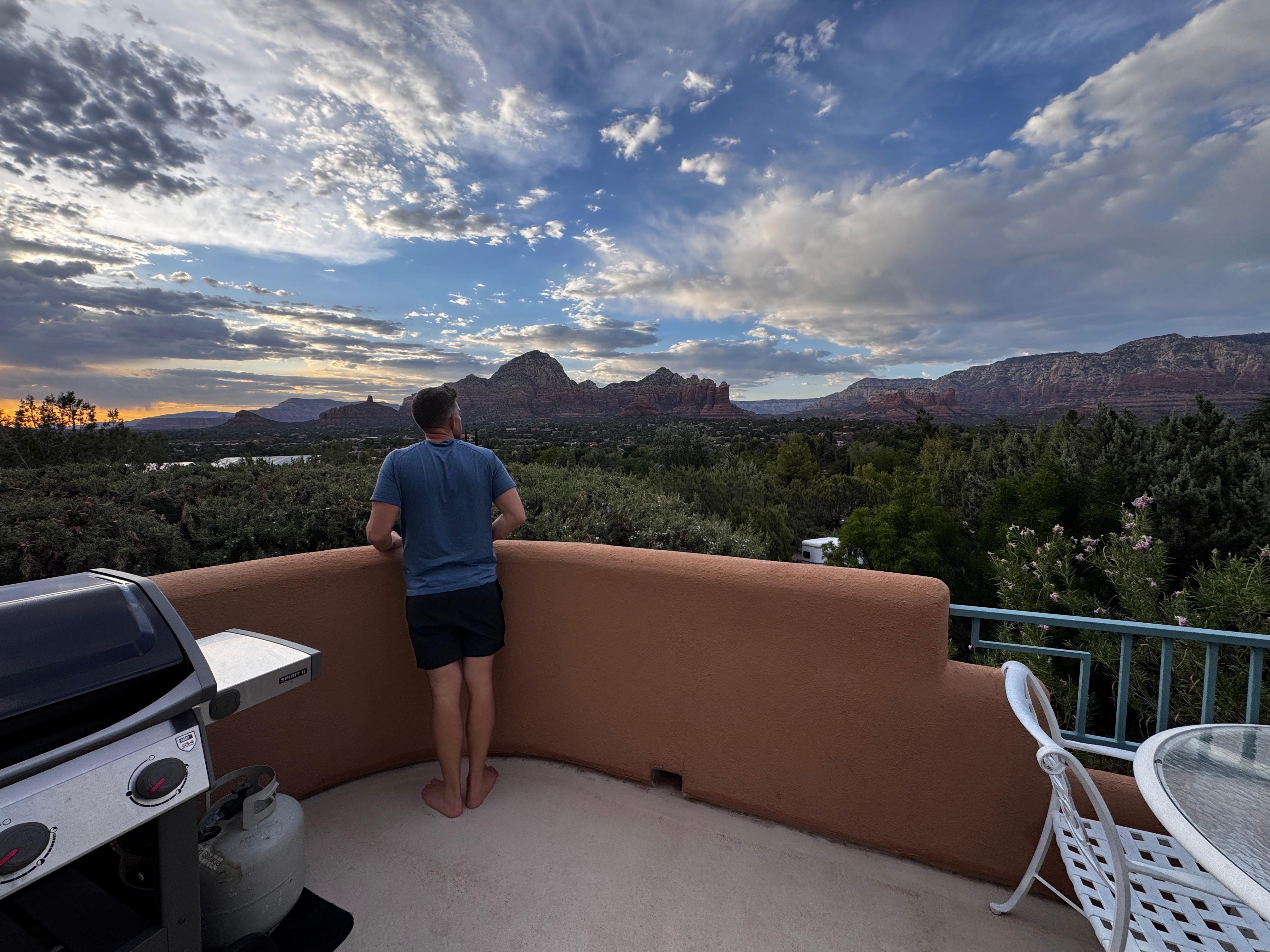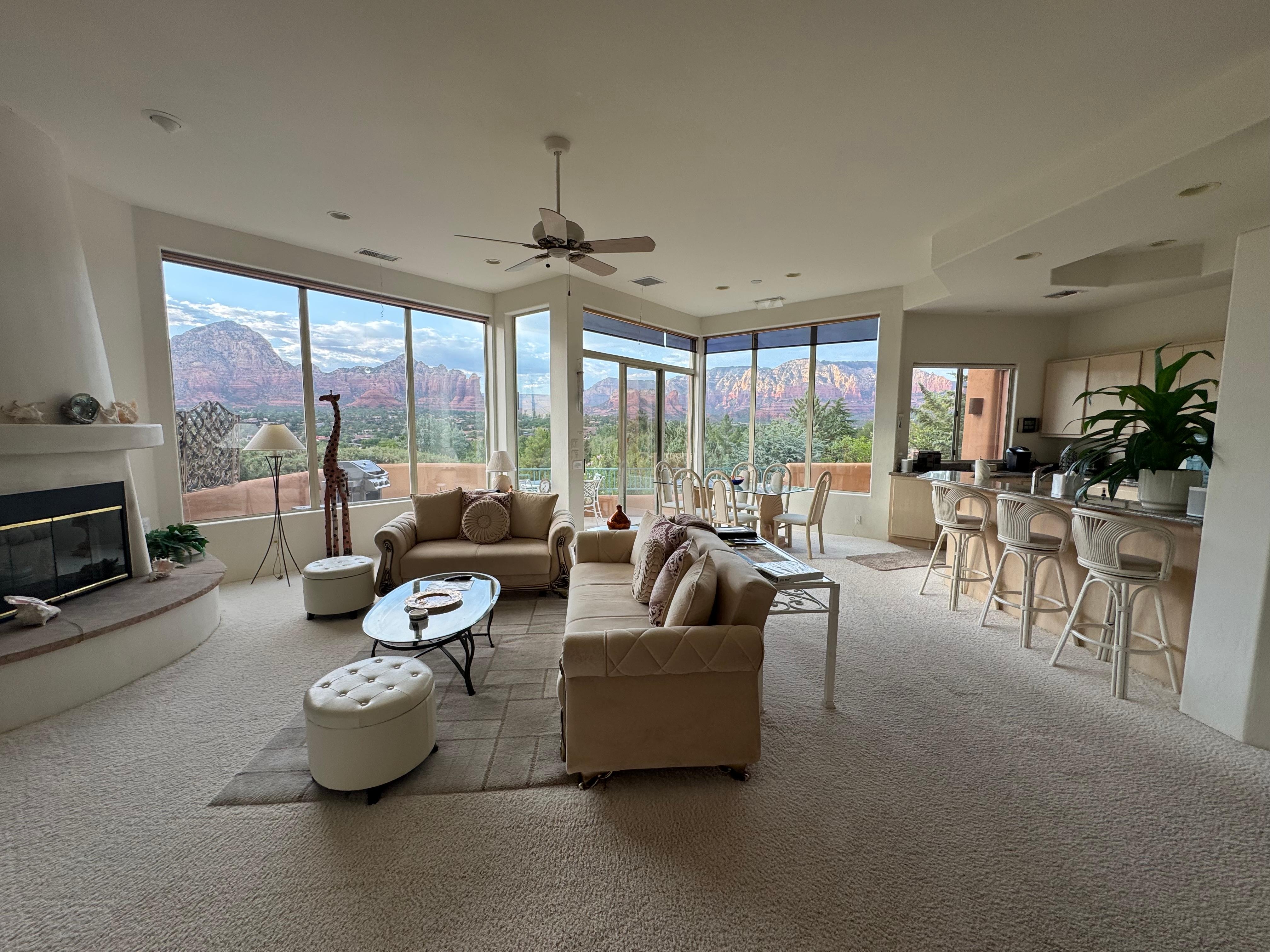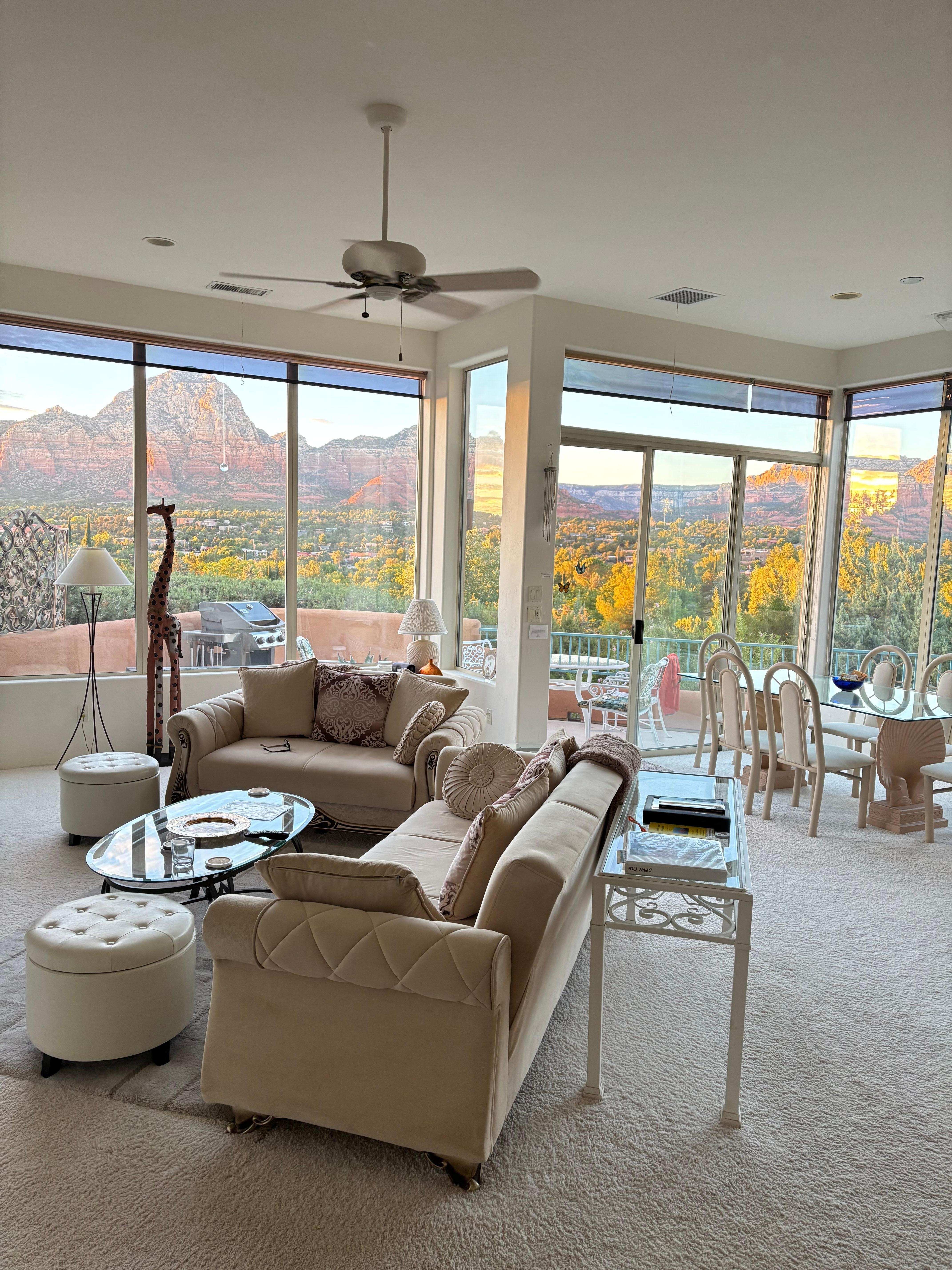From the great room’s wall of windows and the deck, take in Doe Mountain, Chimney Rock, Thunder Mountain, Coffee Pot Rock, Brins Mesa, Wilson Mountain, and the gorge of Oak Creek Canyon—framed by a lush treetop canopy below. Guests often say the views beat the photos. You can even spot Chetan’s bird-feeding area from the deck!