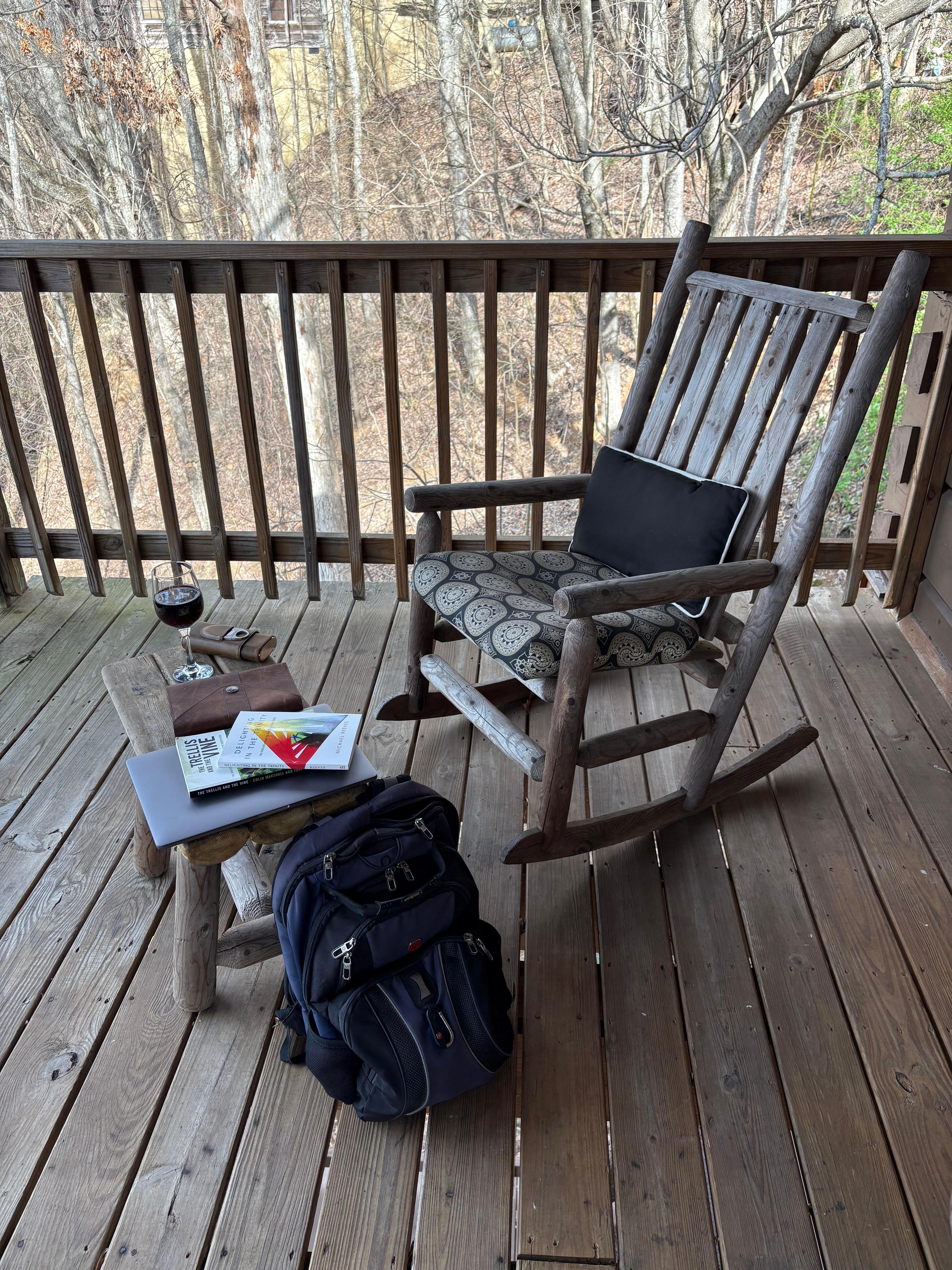 Access to the first of two outdoor decks through the master bedroom as well as the living room. Outside on this deck you will find wooden rocker and love seat to take in the scenery. You can also grill up some hamburgers, hot dogs, chicken or a juicy steak up on the propane gas grill. FYI, They are starting construction on a cabin next door, so there may be some construction noise during the day. The good news about that is they cleared some trees, and the view is better than it ever has been.