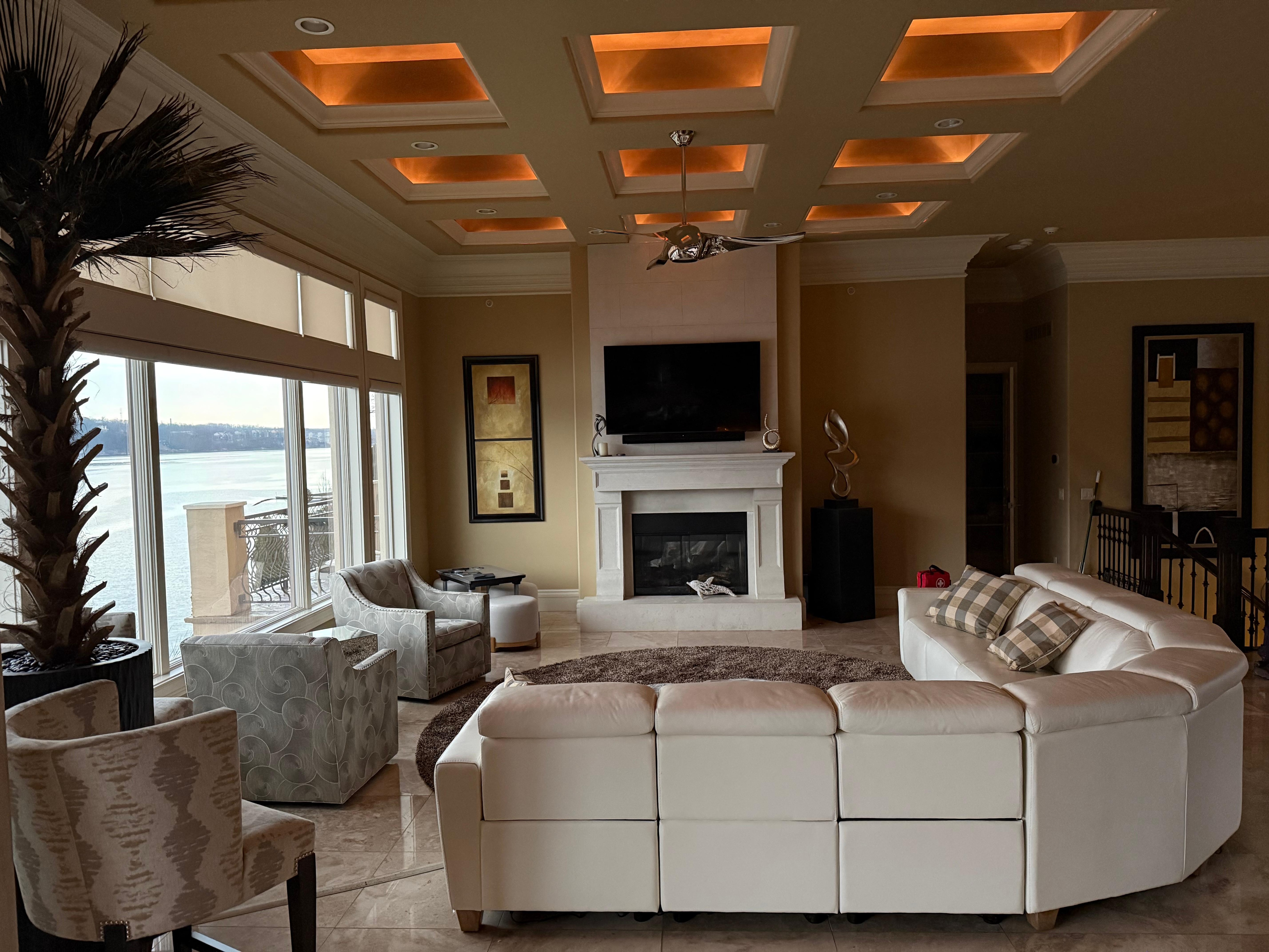 *Large living room with floor to ceiling windows and 65' led tv, Ruku, with Sonos surround sound, 32" Infinity Game table, Oasis Side Table