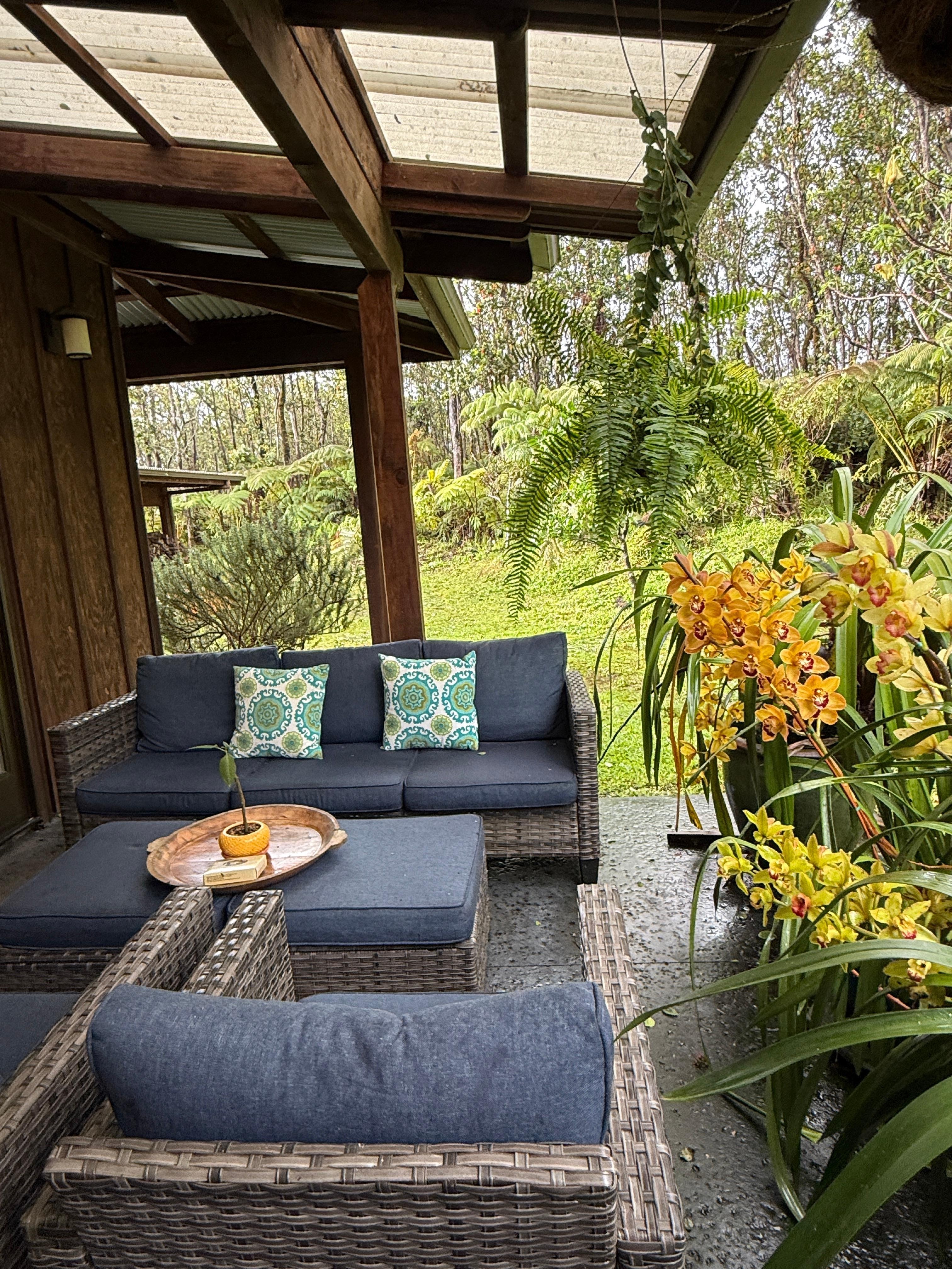 One large bathroom with Jacuzzi tub and shower. All wood floors and ceiling fans with gas fireplace and beautiful full chefs kitchen with all new Samsung appliances and washer/dryer. Large lotus pond and 2 private covered patios (lanai) with seating. Long desk looking over pond to comfortably be on laptop. Closest home is 400 ft away through the forest, so no next door barking dogs or roosters. Extremely quiet and peaceful, unique and a fully Hawaiian experience. Perfect for those who want to explore and hike in an upper elevation tropical rain forest. Not really the place for loud late night drinking parties.