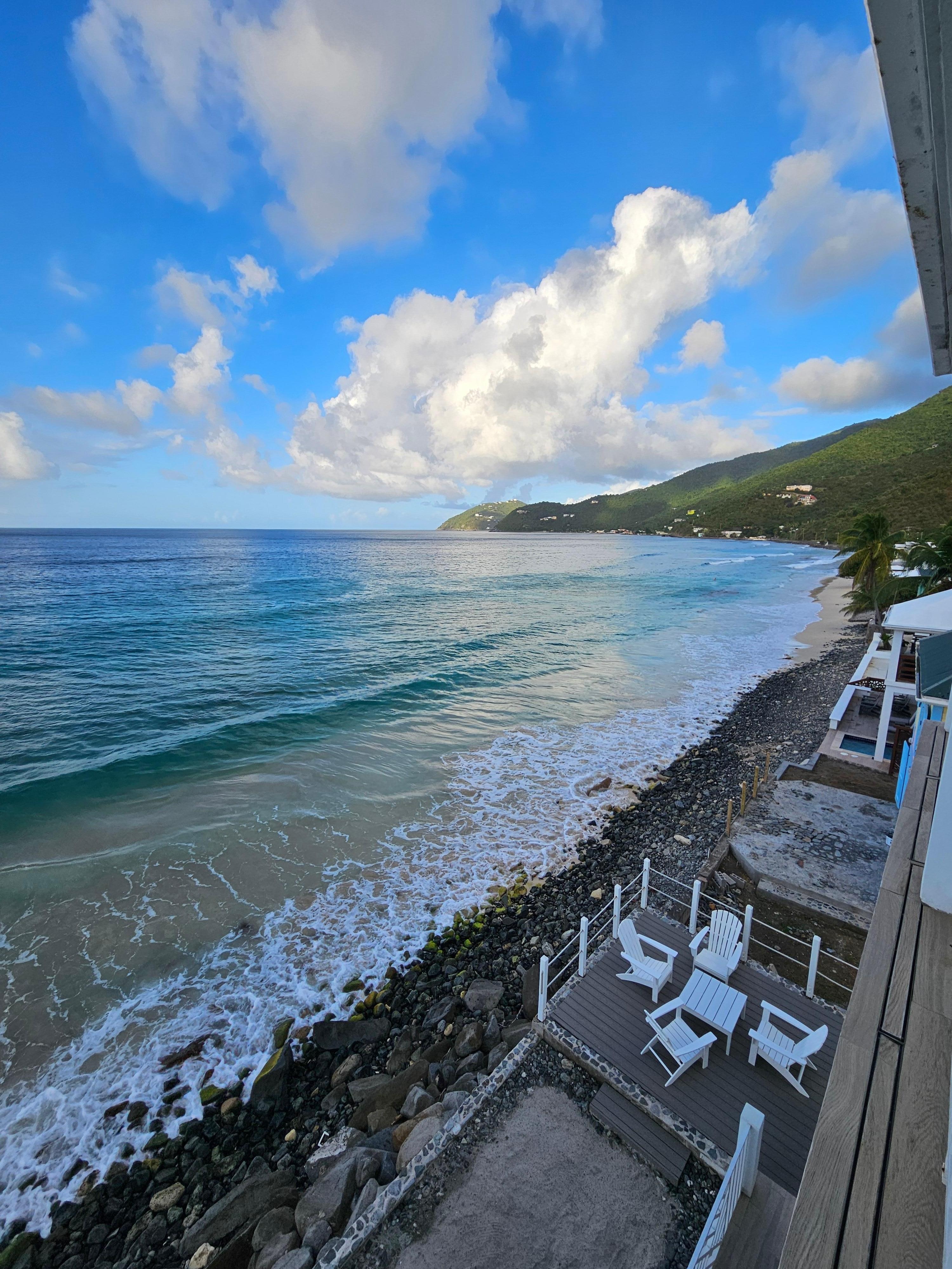 You will be delighted by the stunning sea views from the terraces - which are less than 10 feet from the water. You can see out to Jost Van Dyke and along the North Shore of Tortola, and watch the surfers and the sea life. The location is perfect for surfers as the Apple Bay reef provides good surfing - in particular from November to April when the northern swells roll in. All year round swimming is beautiful at Smugglers Cove, and, depending on the sea conditions, you can swim with the surfers at Little Apple Bay and Apple Bay. Surf board hire can be arranged with www.bviwatertoys.com who are in Sopers Hole.